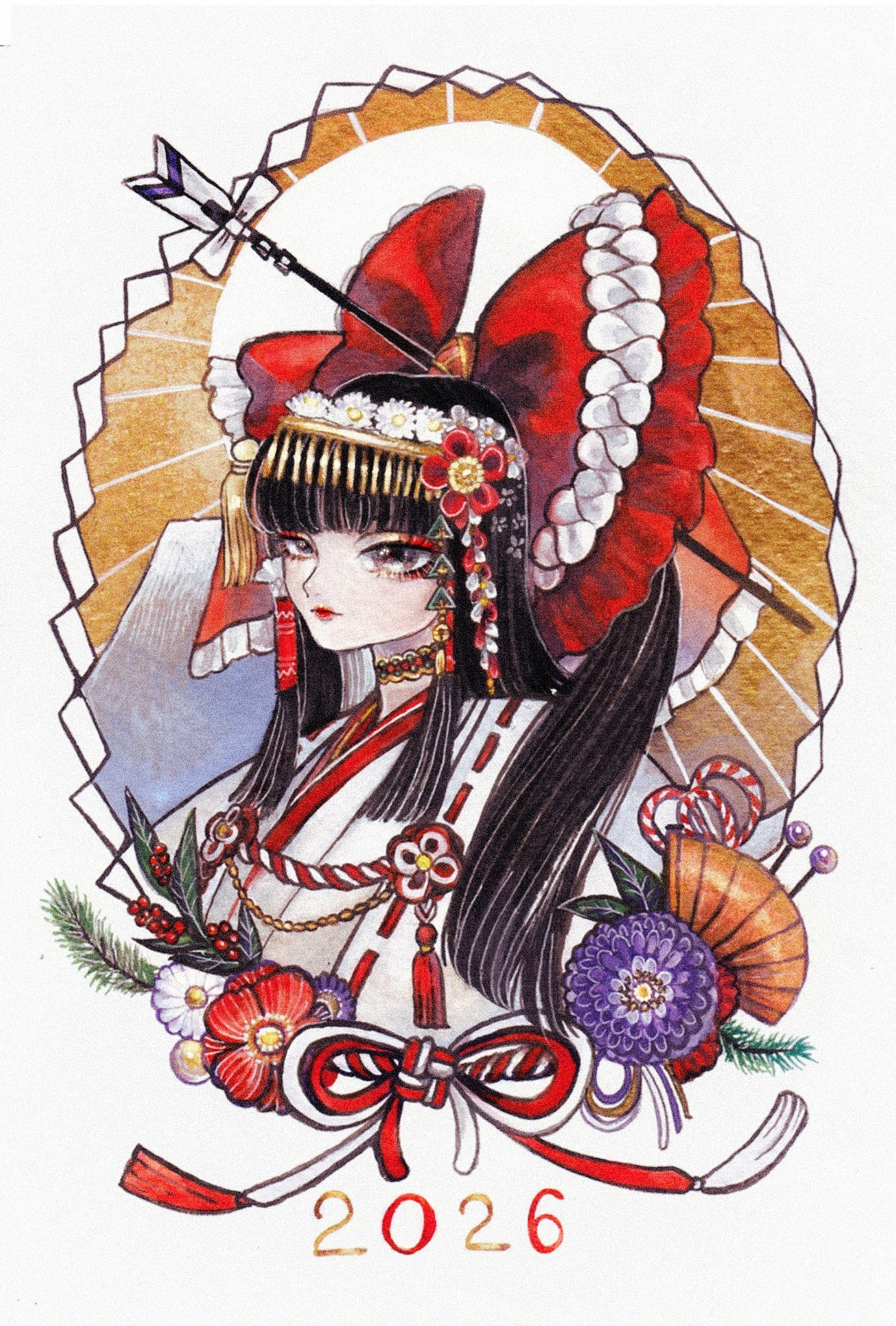 1girl 2026 ascot black_hair blunt_ends bow branch chinese_knot choker comb commentary cropped_shoulders eyeliner flower flower_wreath frilled_bow frilled_hair_tubes frills grey_eyes hair_bow hair_flower hair_ornament hair_stick hair_tubes hakurei_reimu happy_new_year head_wreath highres japanese_clothes long_hair looking_at_viewer makeup mount_fuji new_year painting_(medium) pine_tree plum_blossoms red_bow red_eyeliner ribbon ribbon_trim shide solo sunburst sunburst_background surume_(surumemodoki) touhou traditional_media tree watercolor_(medium) white_background
