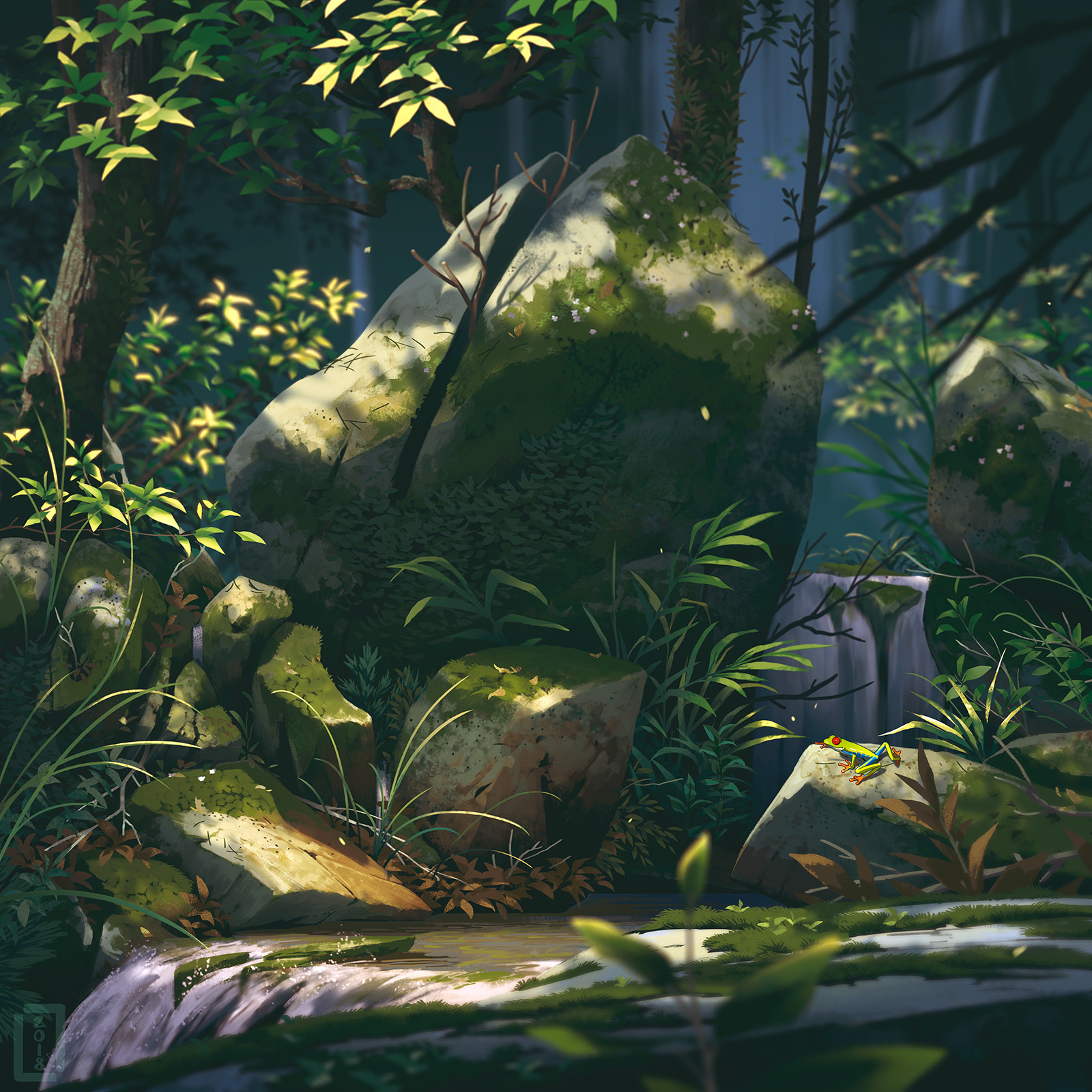 animal branch commentary day english_commentary forest frog grass highres landscape leaf light_rays lorenzo_lanfranconi moss nature no_humans original outdoors painterly plant rock scenery stick tree water waterfall