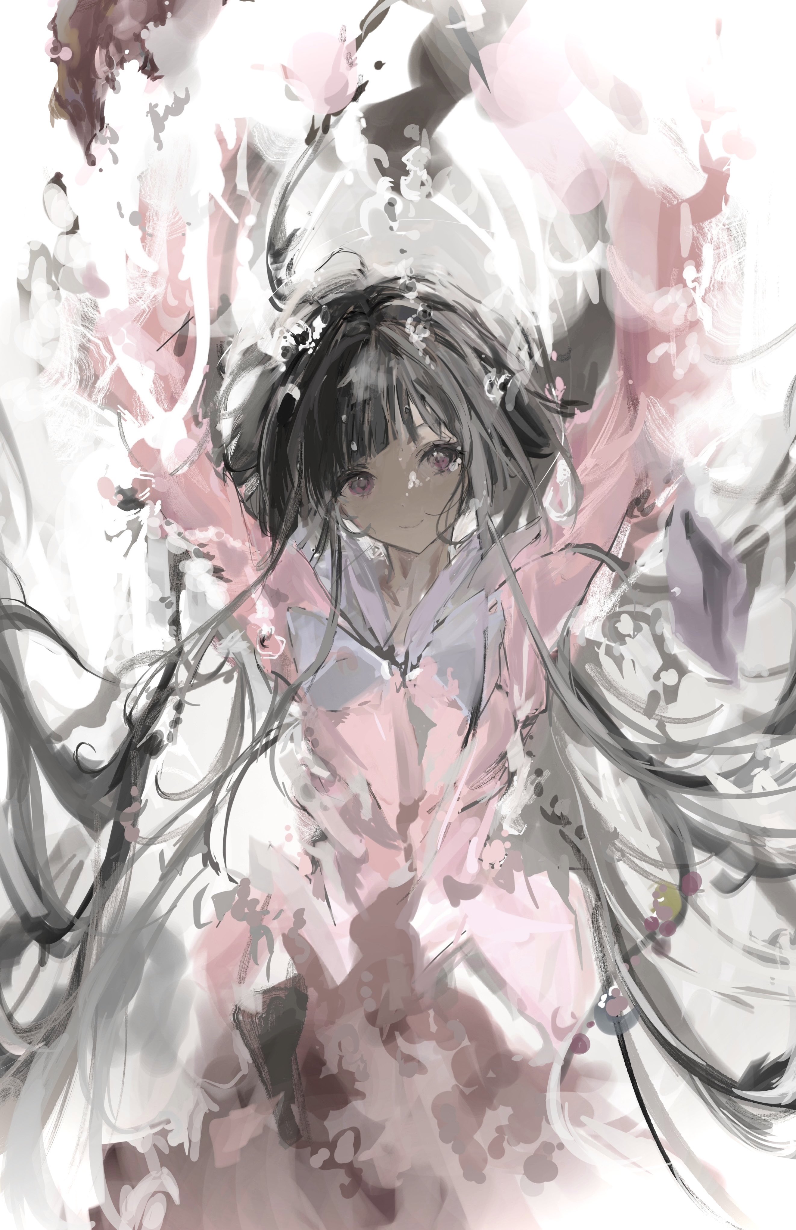 1girl absurdres arms_up black_hair blunt_bangs bow bowtie branch closed_mouth floating_hair highres hime_cut houraisan_kaguya jeweled_branch_of_hourai long_hair long_sleeves looking_at_viewer pink_eyes pink_shirt sesmkun shirt smile solo touhou white_bow white_bowtie