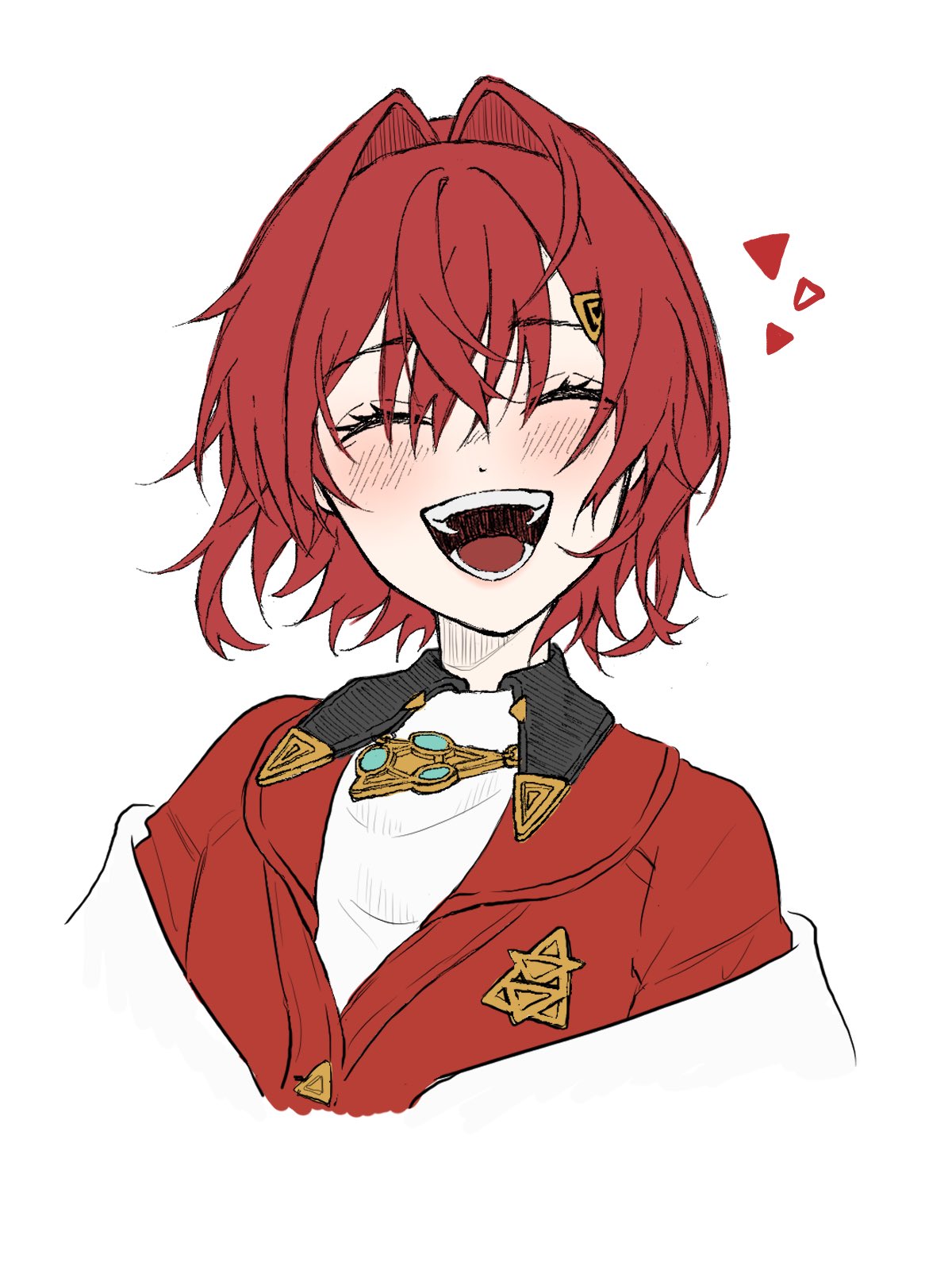 1girl :d ^_^ ange_katrina ange_katrina_(1st_costume) blush cardigan closed_eyes commentary eyelashes hair_intakes hatching_(texture) highres long_bangs medium_hair nijisanji open_mouth red_cardigan red_hair simple_background smile solo symbol-only_commentary teeth triangle ume_aji upper_body virtual_youtuber white_background
