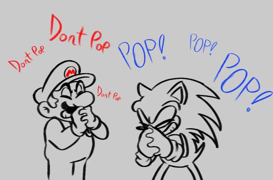 2boys balloon closed_eyes facial_hair gloves hat laughing mario mario_(series) multiple_boys mustache nintendo sega sonic_(series) sonic_the_hedgehog standing