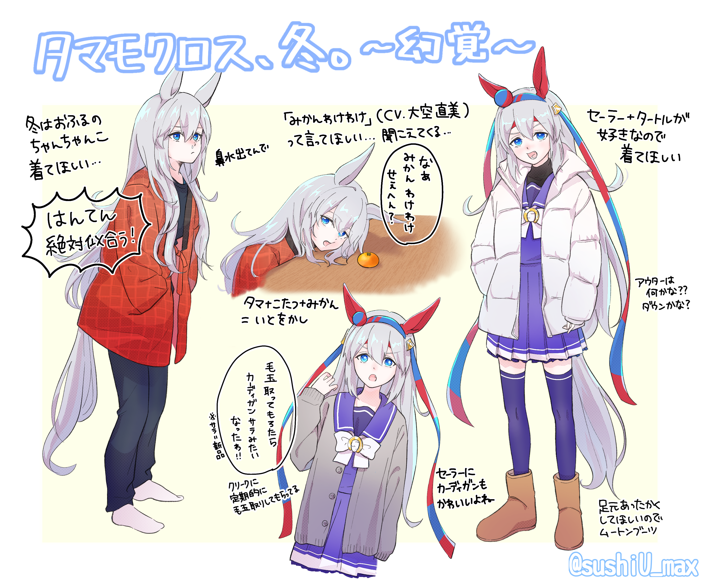 1girl :d absurdres alternate_costume animal_ears black_pants black_sweater blue_eyes blue_hairband boots bow bowtie brown_boots cardigan checkered_clothes checkered_jacket commentary_request cropped_legs down_jacket ear_covers fang food fruit full_body fur_boots grey_cardigan grey_hair hair_between_eyes hair_over_shoulder hairband hand_in_pocket hand_up hands_in_pockets hanten_(clothes) head_on_table headband highres horse_ears horse_girl horse_tail jacket kadokura_(sushiu_max) kotatsu layered_shirt long_hair long_sleeves looking_at_viewer mandarin_orange multiple_views open_cardigan open_clothes open_jacket open_mouth pants pleated_skirt purple_shirt purple_skirt purple_thighhighs raised_eyebrow raised_inner_eyebrows red_hairband red_headband red_jacket runny_nose sailor_collar school_uniform shirt sidelocks sitting skirt sleeves_past_fingers sleeves_past_wrists smile snot sparkling_eyes standing striped_clothes striped_hairband sweater sweater_under_shirt table tail tamamo_cross_(umamusume) thighhighs tracen_school_uniform translation_request turtleneck turtleneck_sweater twitter_username ugg_boots umamusume under_kotatsu under_table v-shaped_eyebrows very_long_hair white_background white_bow white_bowtie white_jacket winter_uniform yellow_background zettai_ryouiki