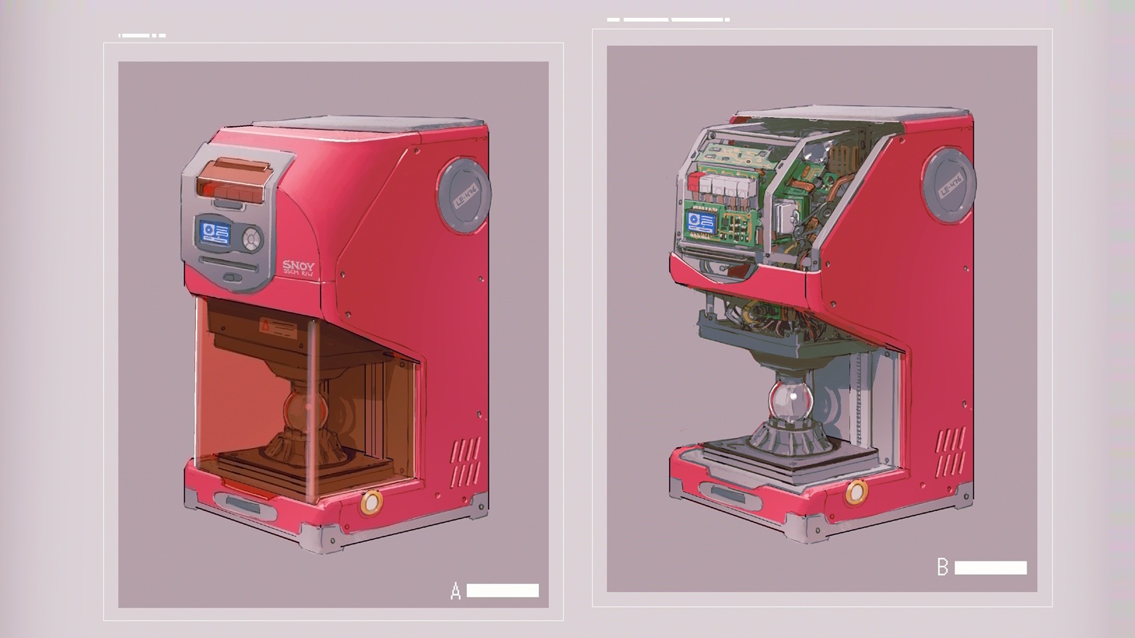 border brand_name_imitation circuit_board cut-away grey_border highres machine multiple_views no_humans notfuji object_focus original pink_theme science_fiction sony