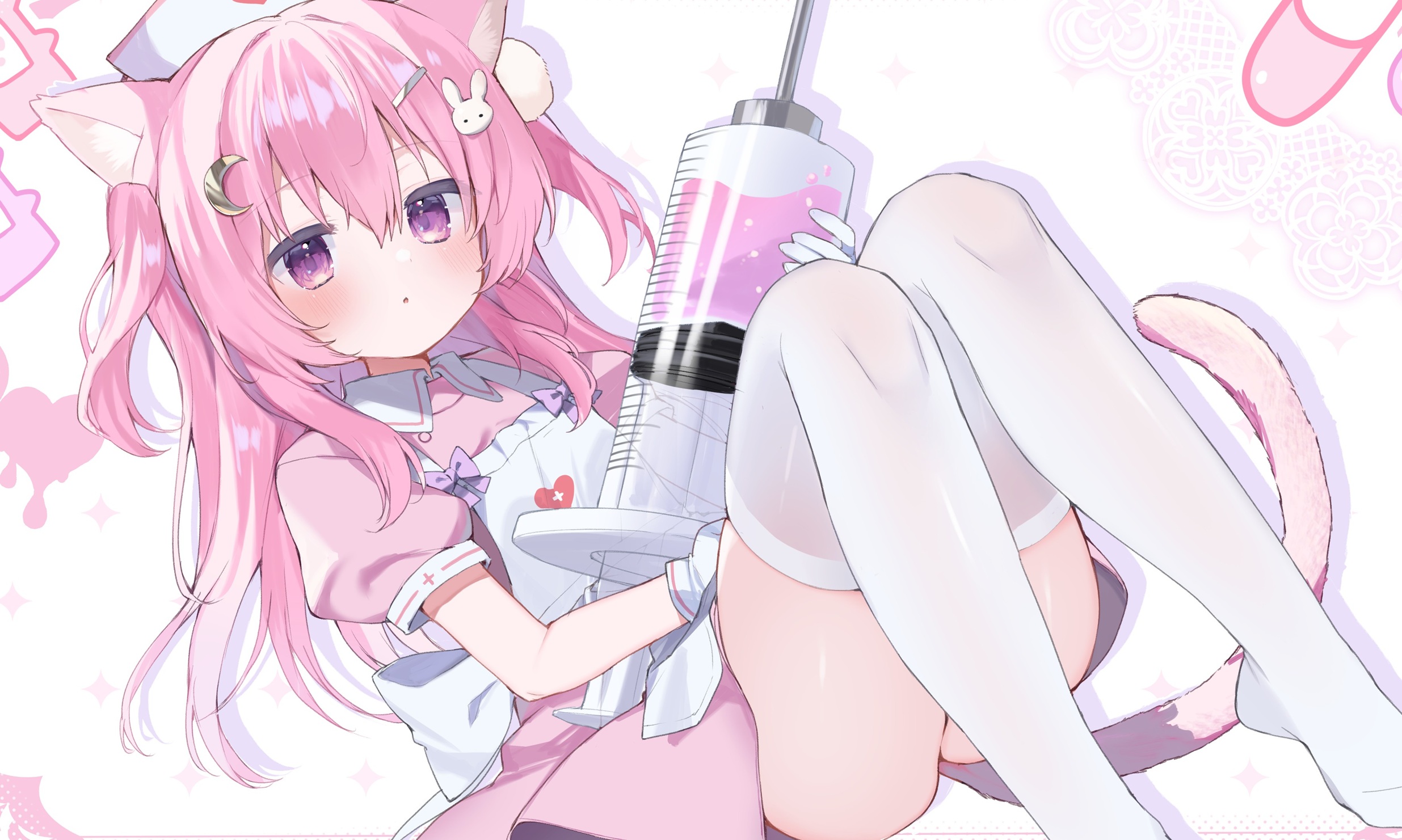 1girl animal_ear_fluff animal_ears apron blush bow breasts cat_ears cat_girl cat_tail chestnut collar collared_dress commission crescent dress expressionless eyebrows_hidden_by_hair feet_out_of_frame frills hair_between_eyes hair_ornament hairclip hat highres holding knees_up long_hair looking_at_viewer no_shoes nurse nurse_cap original parted_lips pill pink_dress pink_hair puffy_short_sleeves puffy_sleeves purple_eyes ribbon short_sleeves sidelocks simple_background sitting skeb_commission solo syringe tail takepoison thighhighs thighs twintails two_side_up white_thighhighs