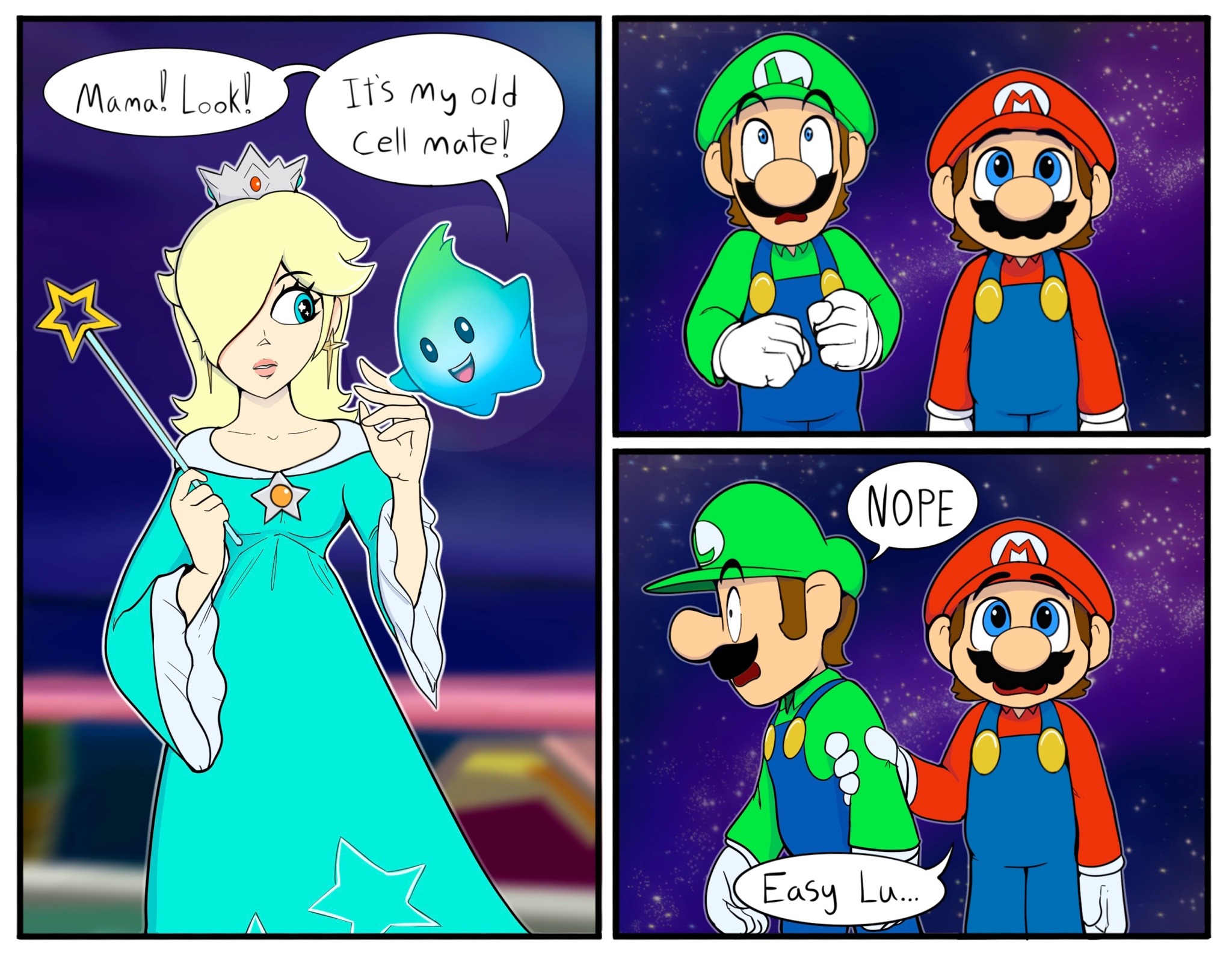 1girl 2boys black_hair blonde_hair blue_dress brothers brown_hair crown dress earrings facial_hair gloves grin hair_over_one_eye hat jewelry looking_at_another luigi luma_(mario) mario mario_(series) multiple_boys mustache rosalina siblings smile speech_bubble standing talking the_super_mario_bros._movie the_super_mario_galaxy_movie wand witch