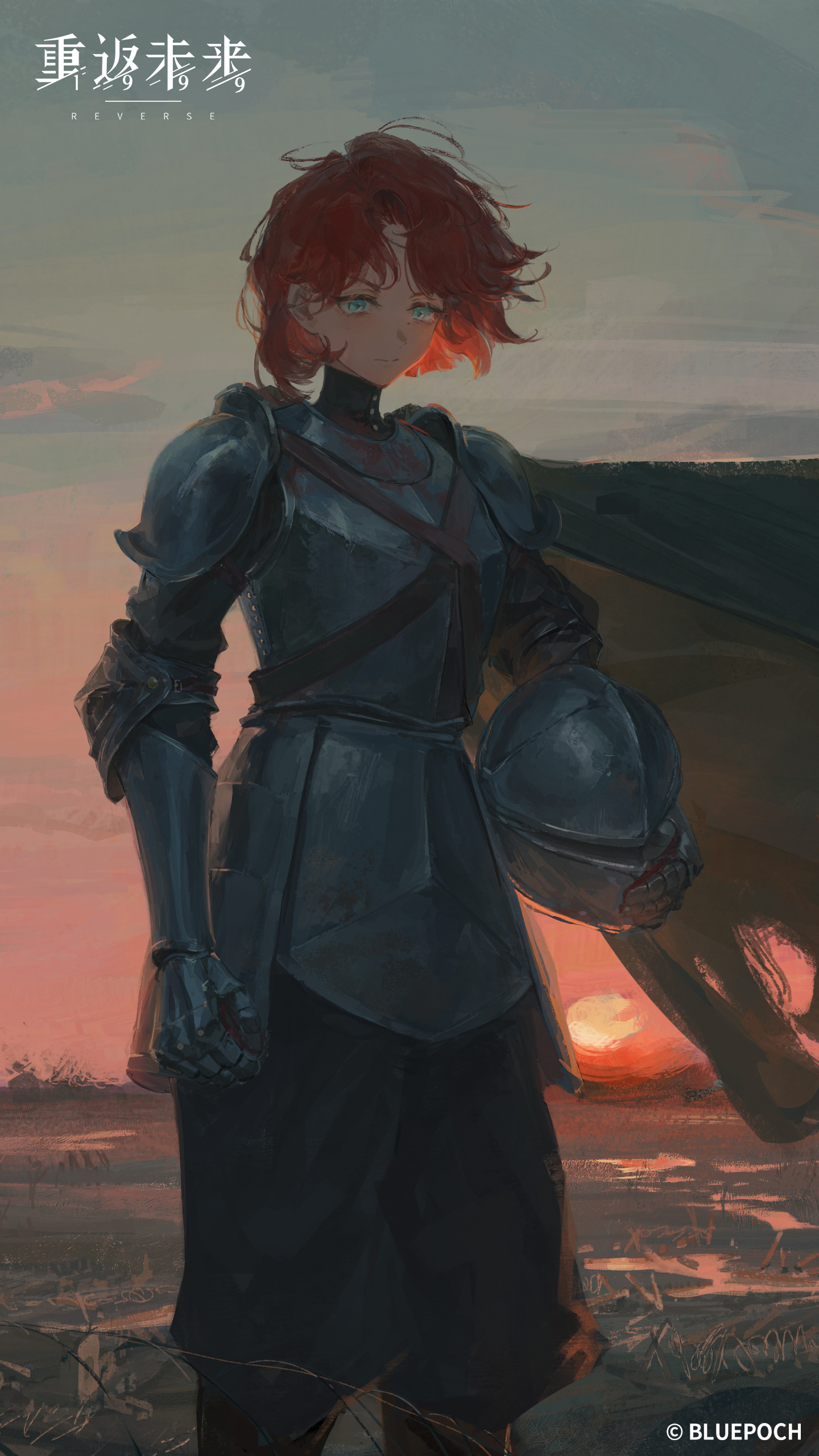 1girl absurdres armet armor belt black_pants blue_eyes breastplate brown_belt cape closed_mouth copyright_name copyright_notice cowboy_shot elbow_pads floating_cape gauntlets gradient_sky green_cape grey_sky helmet highres holding holding_unworn_helmet horizon logo looking_down marsha_(reverse:1999) mole mole_under_eye official_art official_wallpaper outdoors pants red_hair red_sky reverse:1999 short_hair shoulder_armor shoulder_belt sky solo standing sun sunset unworn_headwear unworn_helmet