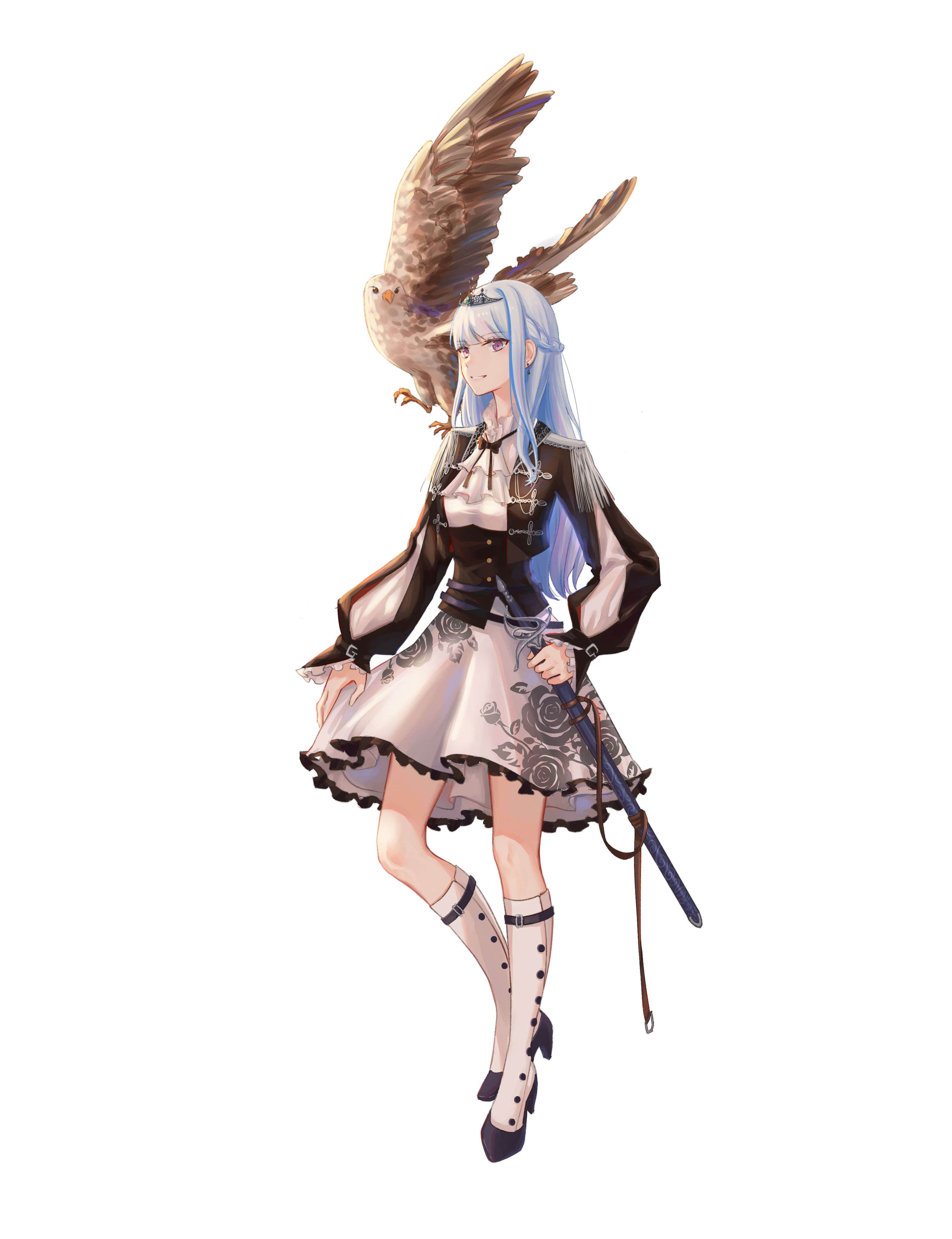 1girl absurdres alternate_costume ascot belt bird black_bow black_bowtie black_corset black_jacket blue_belt blue_hair boots bow bowtie braid breasts brown_bird commentary corset cropped_jacket earrings epaulettes floral_print floral_print_skirt frilled_shirt_collar frilled_skirt frills full_body grin half_up_braid high_heels highres holding holding_sword holding_weapon jacket jewelry knee_boots lips lize_helesta long_hair long_sidelocks long_sleeves looking_at_viewer mini_bowtie miniskirt multicolored_hair multiple_belts nijisanji open_clothes open_jacket print_skirt puffy_long_sleeves puffy_sleeves purple_eyes scabbard sheath sheathed shirt shirt_tucked_in sidelocks simple_background skirt sleeves_past_wrists slms small_breasts smile solo standing streaked_hair sword tiara two-tone_hair underbust very_long_hair virtual_youtuber weapon white_background white_boots white_hair white_shirt white_skirt