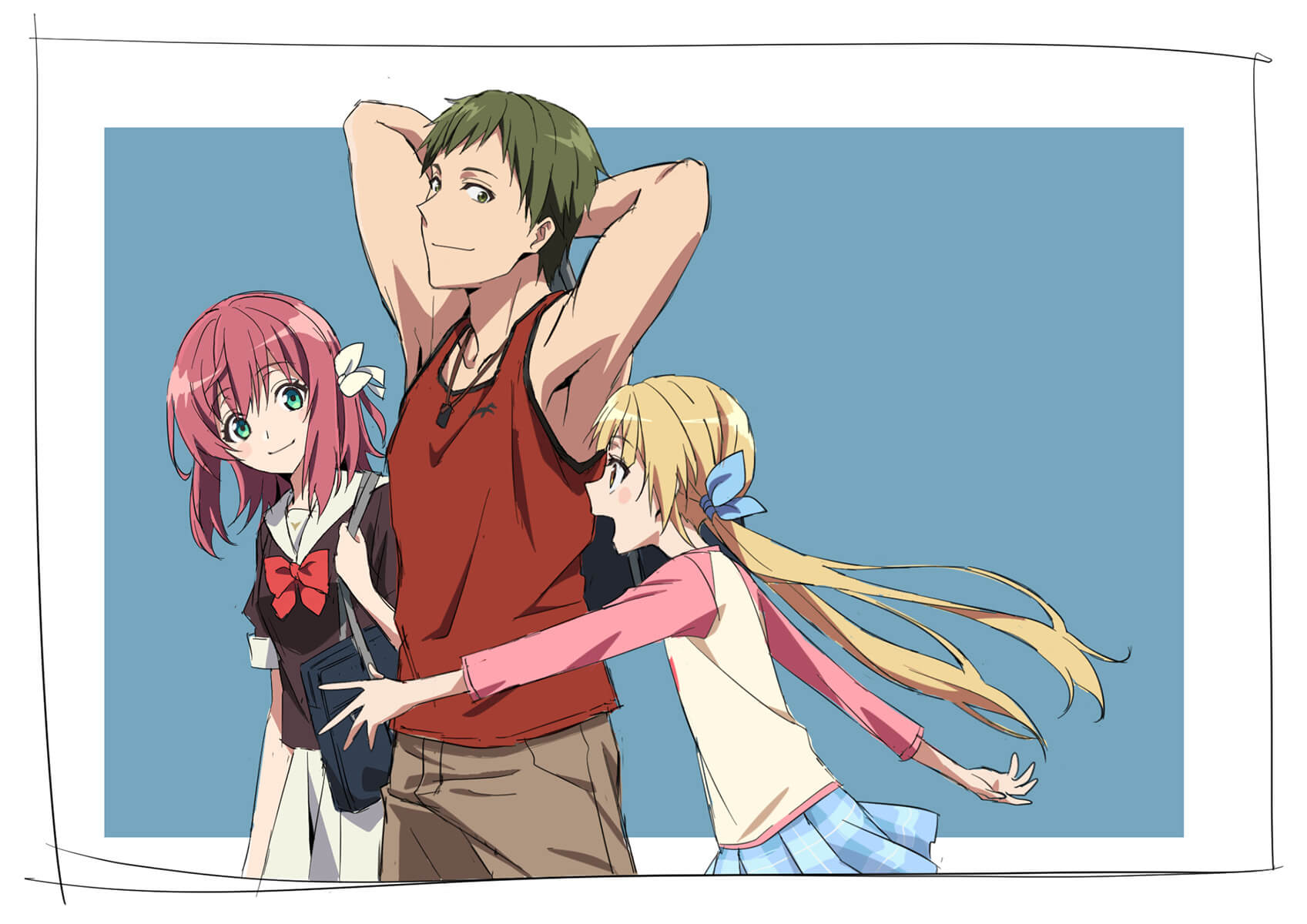 1boy 2girls aqua_eyes armpits arms_behind_head atri-my_dear_moments- bag blonde_hair blue_background blue_ribbon blue_skirt blush_stickers border bow bowtie brown_eyes brown_shirt casual closed_mouth cowboy_shot downturned_eyes floating_hair from_side green_hair hair_bow hair_ribbon height_difference highres kamishiro_minamo long_hair long_sleeves looking_at_another low_twintails medium_hair miniskirt multiple_girls nanami_ririka nojima_ryuuji nose ogawa_mayumi outside_border plaid_clothes plaid_skirt pleated_skirt profile red_bow red_bowtie red_hair red_shirt ribbon sailor_collar school_uniform serafuku shirt short_hair short_sleeves shoulder_bag simple_background sketch skirt sleeveless sleeveless_shirt smile straight_hair tareme twintails very_long_hair white_border white_bow white_sailor_collar white_skirt