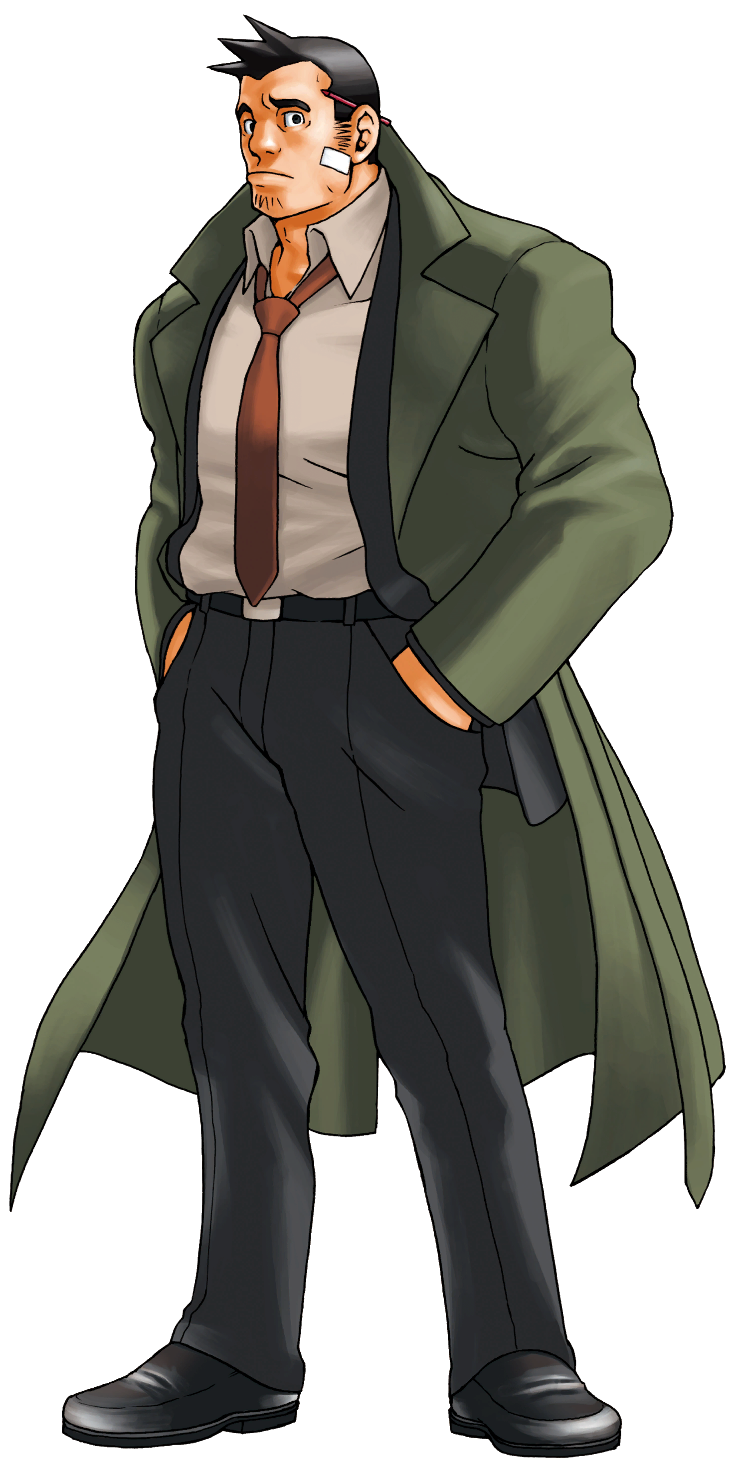 1boy absurdres ace_attorney bandages belt black_hair closed_mouth commentary dick_gumshoe edaki_shin'ya english_commentary facial_hair full_body hands_in_pockets highres long_coat male_focus necktie object_behind_ear official_art pencil simple_background solo standing third-party_source transparent_background