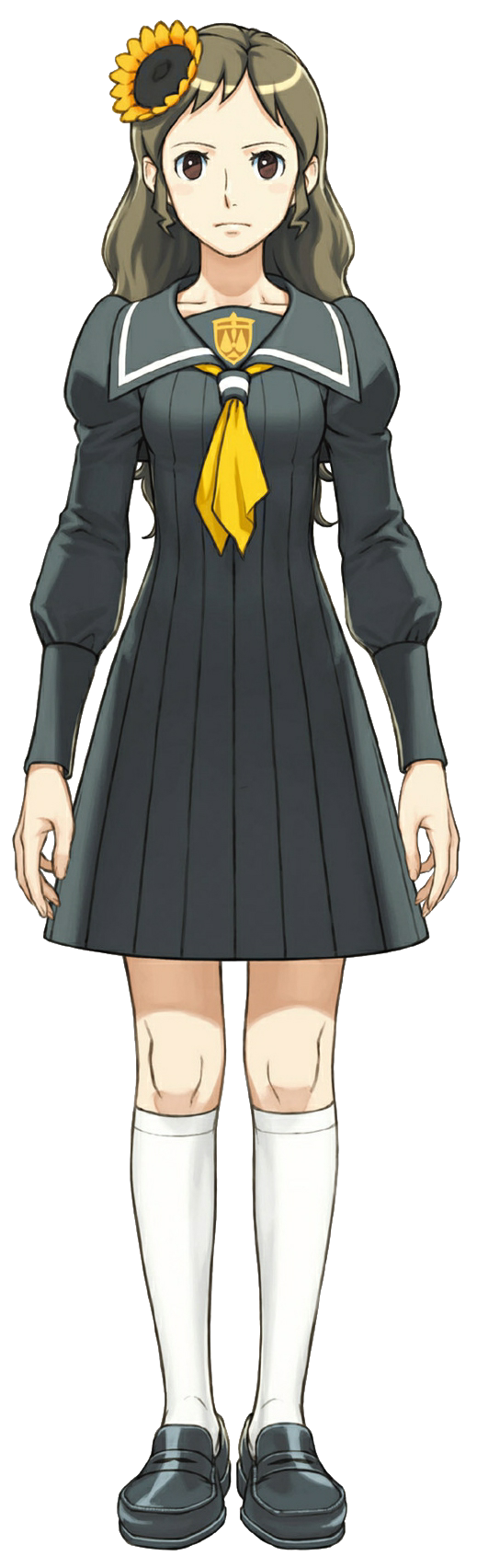 1girl ace_attorney black_dress black_sailor_collar blush blush_stickers brown_eyes brown_hair dress flower full_body fuse_takuro hair_flower hair_ornament highres juniper_woods kneehighs loafers long_hair neckerchief official_art phoenix_wright:_ace_attorney_-_dual_destinies puffy_sleeves sailor_collar school_uniform serafuku shoes short_dress simple_background socks solo standing sunflower sunflower_hair_ornament tachi-e themis_legal_academy_school_uniform transparent_background wavy_hair white_socks yellow_neckerchief