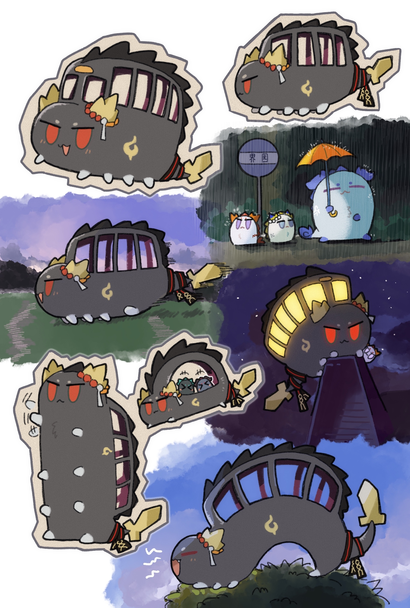 >_< +++ absurdres afterimage arknights blue_eyes blue_sky bus_stop bus_stop_sign chongyue_(arknights) closed_eyes closed_mouth cloud dusk_(arknights) highres holding holding_umbrella ling_(arknights) nekobus nian_(arknights) night orange_umbrella purple_eyes red_eyes sky star_(sky) starry_sky sunset tonari_no_totoro totoro_bus_stop umbrella yu_(arknights) yu_kaoxiang