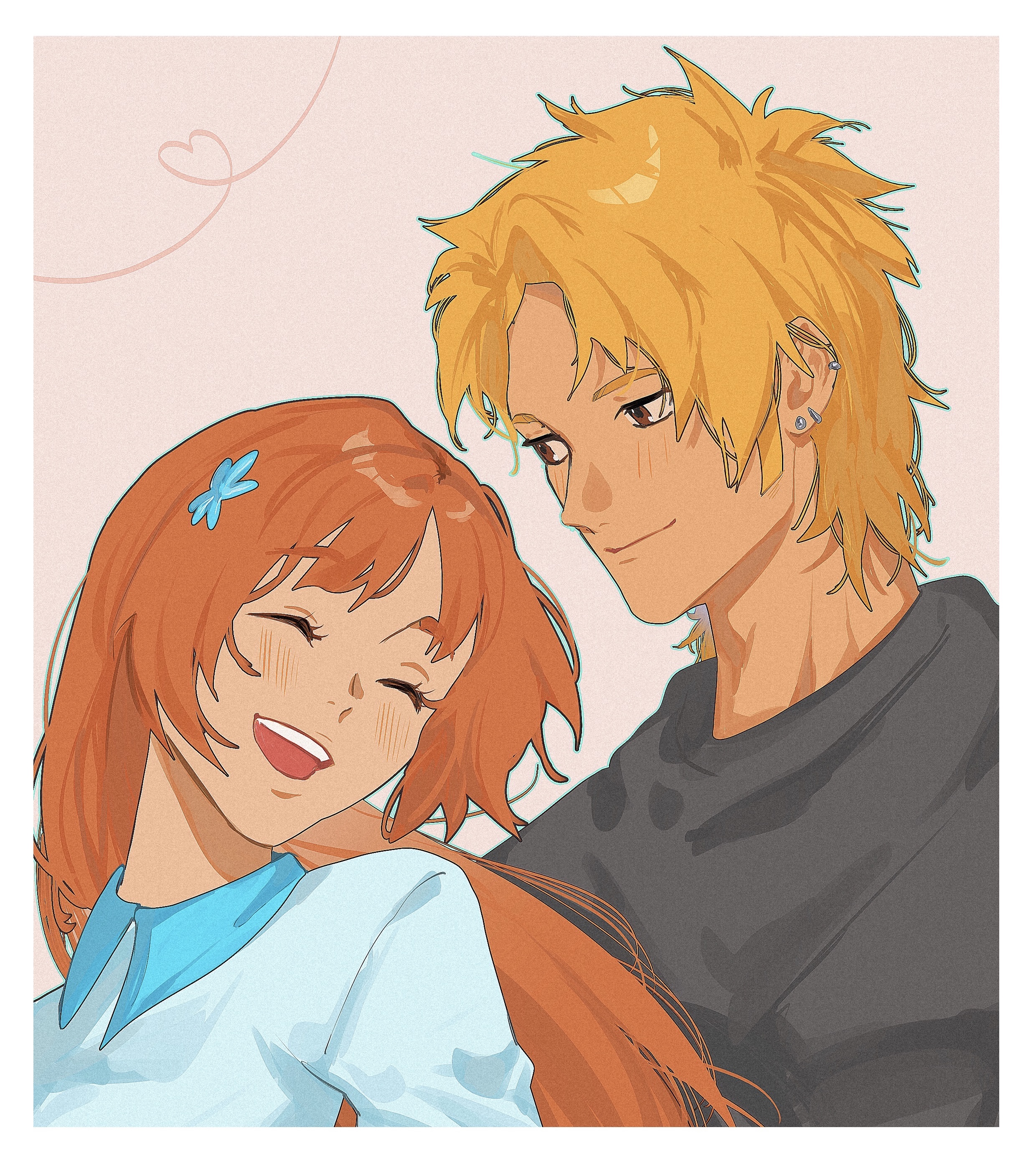 1boy 1girl absurdres black_shirt bleach blonde_hair blue_collar border brown_eyes closed_eyes closed_mouth collar collared_shirt earrings hair_ornament highres inoue_orihime jewelry kurosaki_ichigo light_blush long_hair looking_at_another multiple_earrings open_mouth orange_hair origoism parted_bangs pink_background shirt short_hair smile snowflake_hair_ornament teeth upper_teeth_only white_border white_shirt