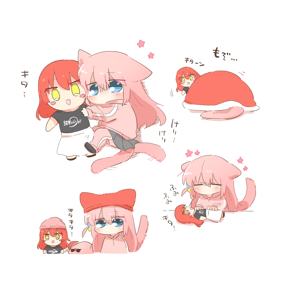 1girl :d animal_ears blue_eyes blush blush_stickers bocchi_the_rock! cat_ears cat_girl cat_tail character_doll chibi chibi_only commentary_request cube_hair_ornament doll dual_persona gotoh_hitori gotoh_hitori_(tsuchinoko) grey_skirt hair_between_eyes hair_ornament hat jacket kemonomimi_mode kessoku_band_t-shirt kita_ikuyo long_hair one_side_up open_mouth pants pants_under_skirt pink_hair pink_jacket pink_pants pleated_skirt rebecca_(keinelove) red_hat simple_background skirt smile tail track_jacket translation_request white_background