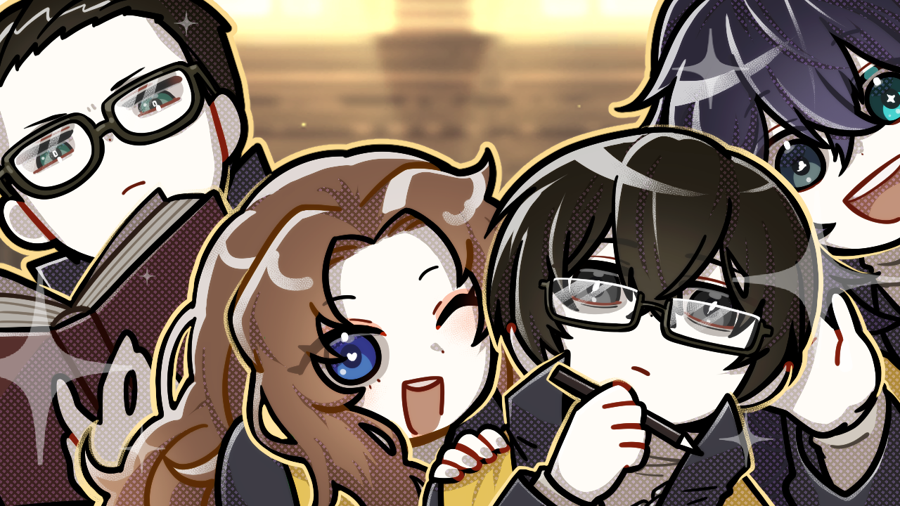 1girl 3boys :d ^_^ aqua_eyes black_coat black_eyes black_hair blue_eyes book brown_hair closed_eyes coat commentary_request curtained_hair dieci_association_south_uniform hair_between_eyes hair_slicked_back hand_on_own_chin heterochromia high_collar holding holding_book holding_pencil hong_lu_(project_moon) limbus_company long_hair meursault_(project_moon) multiple_boys one_eye_closed open_mouth pencil project_moon rodion_(project_moon) sash semi-rimless_eyewear short_hair shoulder_sash smile sparkle suguri_1150615 waving yellow_sash yi_sang_(project_moon)