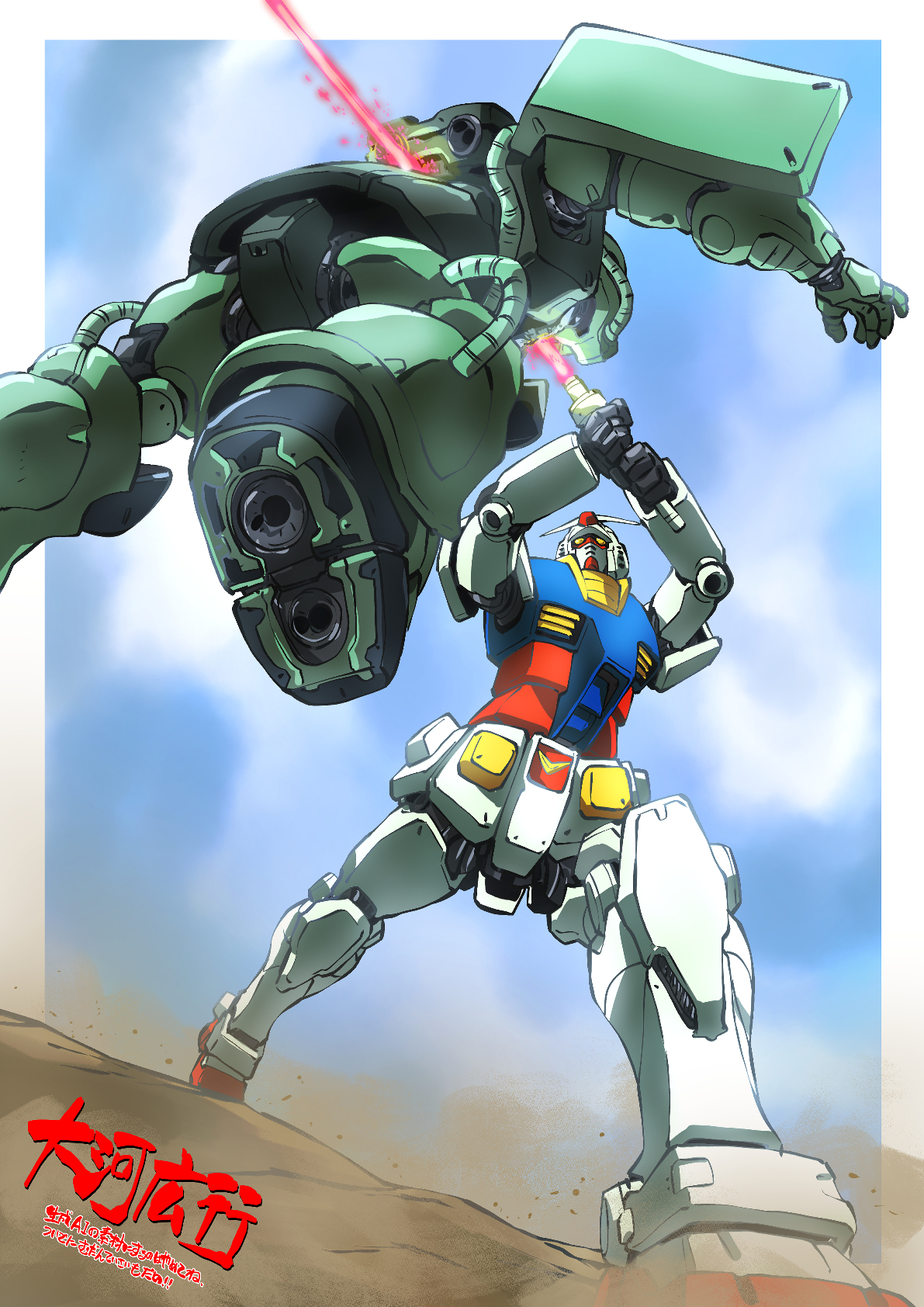 blue_sky commentary_request dutch_angle energy_sword gundam highres holding holding_weapon impaled mecha mecha_focus mobile_suit mobile_suit_gundam no_humans robot rx-78-2_gundam science_fiction sky sword taiga_hiroyuki weapon yellow_eyes zaku_ii