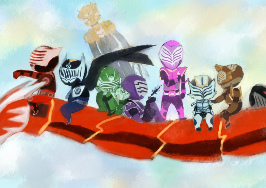 arm_up armor back-to-back bat_(animal) belt blue_armor bronze_armor brown_armor bull cape cobra_(animal) crab dragon dragreder faceplant flying gazelle green_armor grey_armor hand_on_another's_shoulder helmet kamen_rider kamen_rider_gai kamen_rider_imperer kamen_rider_knight kamen_rider_ouja kamen_rider_raia kamen_rider_ryuki kamen_rider_ryuki_(series) kamen_rider_scissors kamen_rider_tiger kamen_rider_zolda knees_to_chest male_focus mask masked masked_male monster multiple_boys pink_armor purple_armor red_armor rhinoceros sitting sky snake standing stingray tiger white_armor