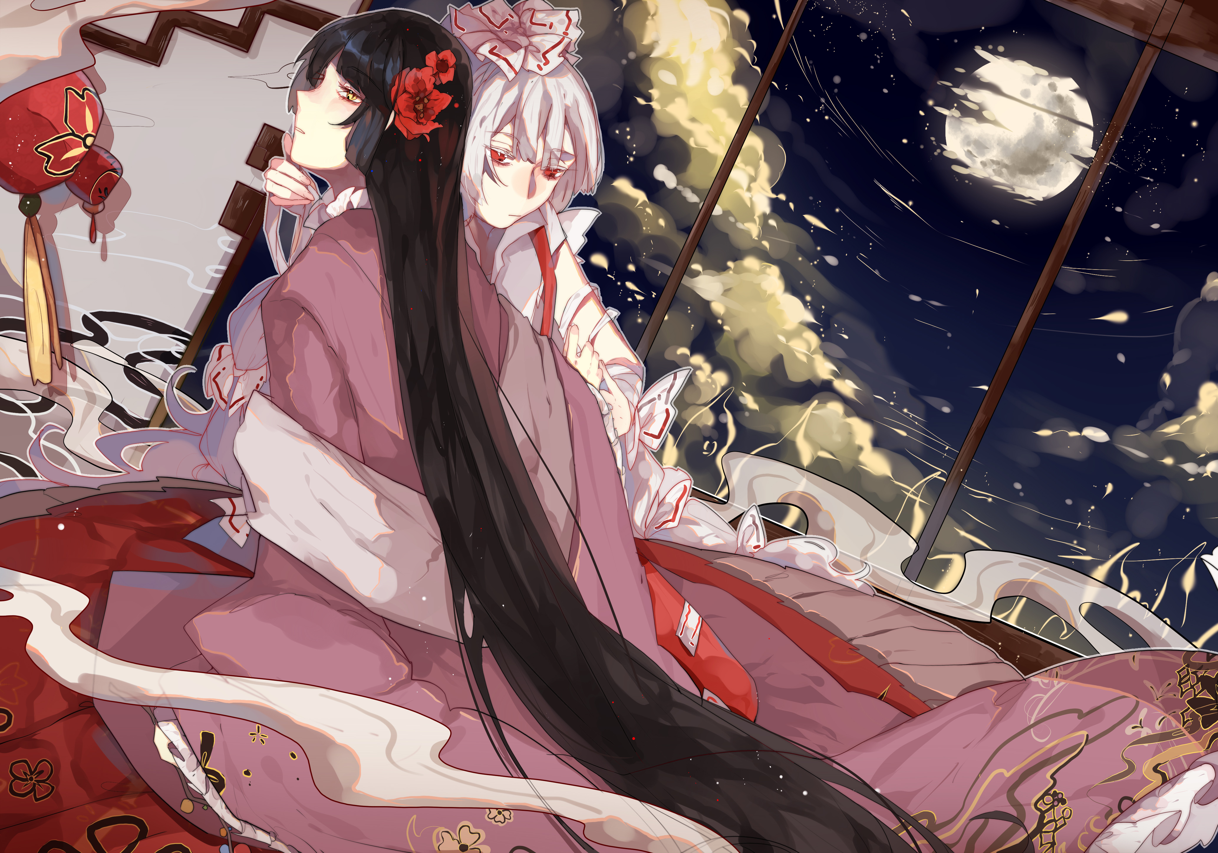 2girls absurdres bow brown_hair chinese_commentary cloud collared_shirt commentary_request flower fujiwara_no_mokou full_moon grey_hair hair_bow hair_flower hair_ornament highres houraisan_kaguya long_hair moon multiple_girls pink_shirt red_eyes red_flower red_skirt shirt sitting skirt suspenders torn_clothes torn_sleeves touhou transparent_(randomhs) very_long_hair white_shirt yellow_eyes yuri