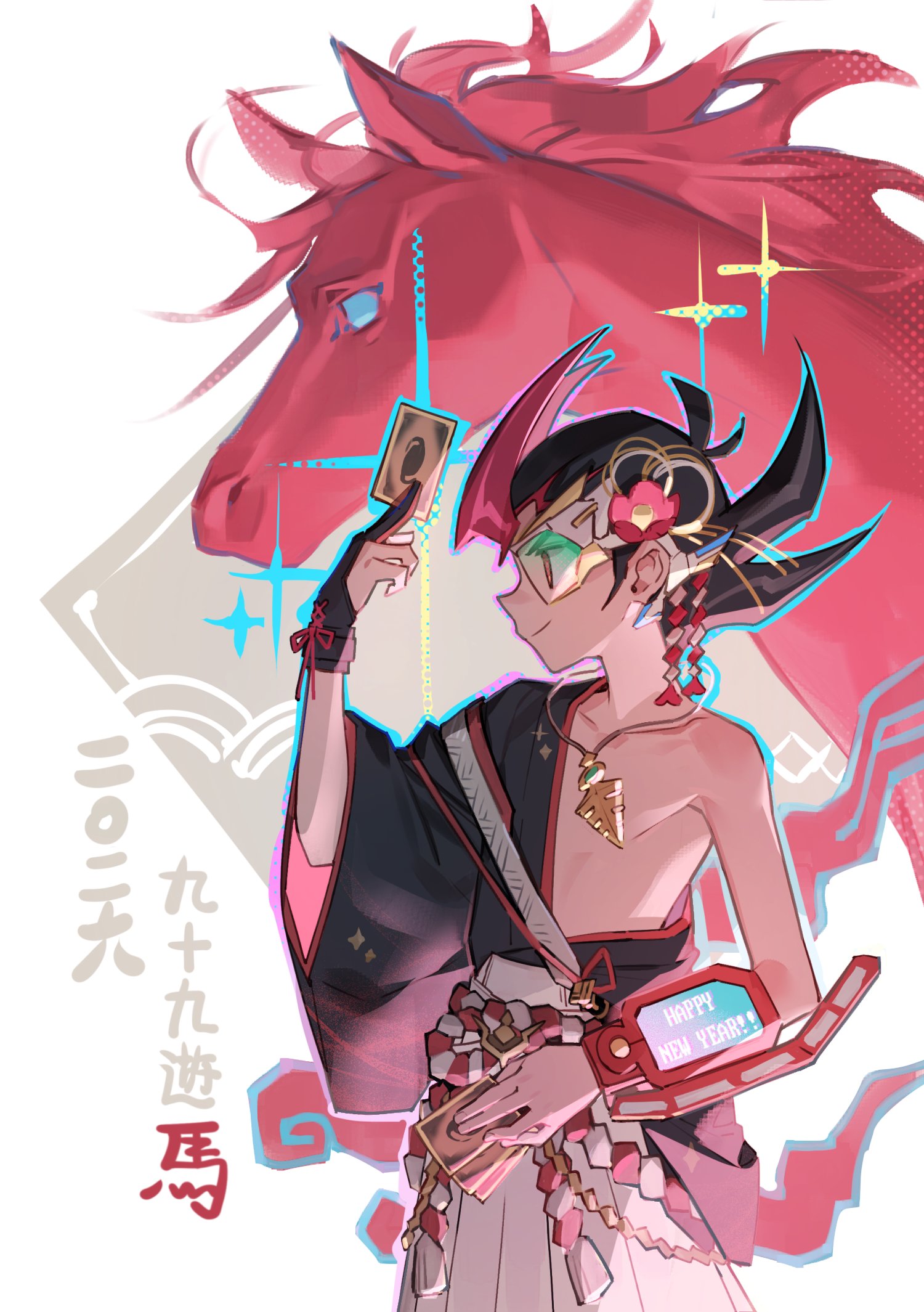 1boy black_hair black_kimono blue_eyes braid card chinese_zodiac deck_of_cards duel_disk from_side highres holding holding_card horse japanese_clothes jewelry kimono male_focus mansu multicolored_hair pendant profile red_hair red_horse scouter single_bare_shoulder single_braid single_off_shoulder solo_focus spiked_hair trading_card tsukumo_yuma two-tone_hair year_of_the_horse yu-gi-oh! yu-gi-oh!_zexal