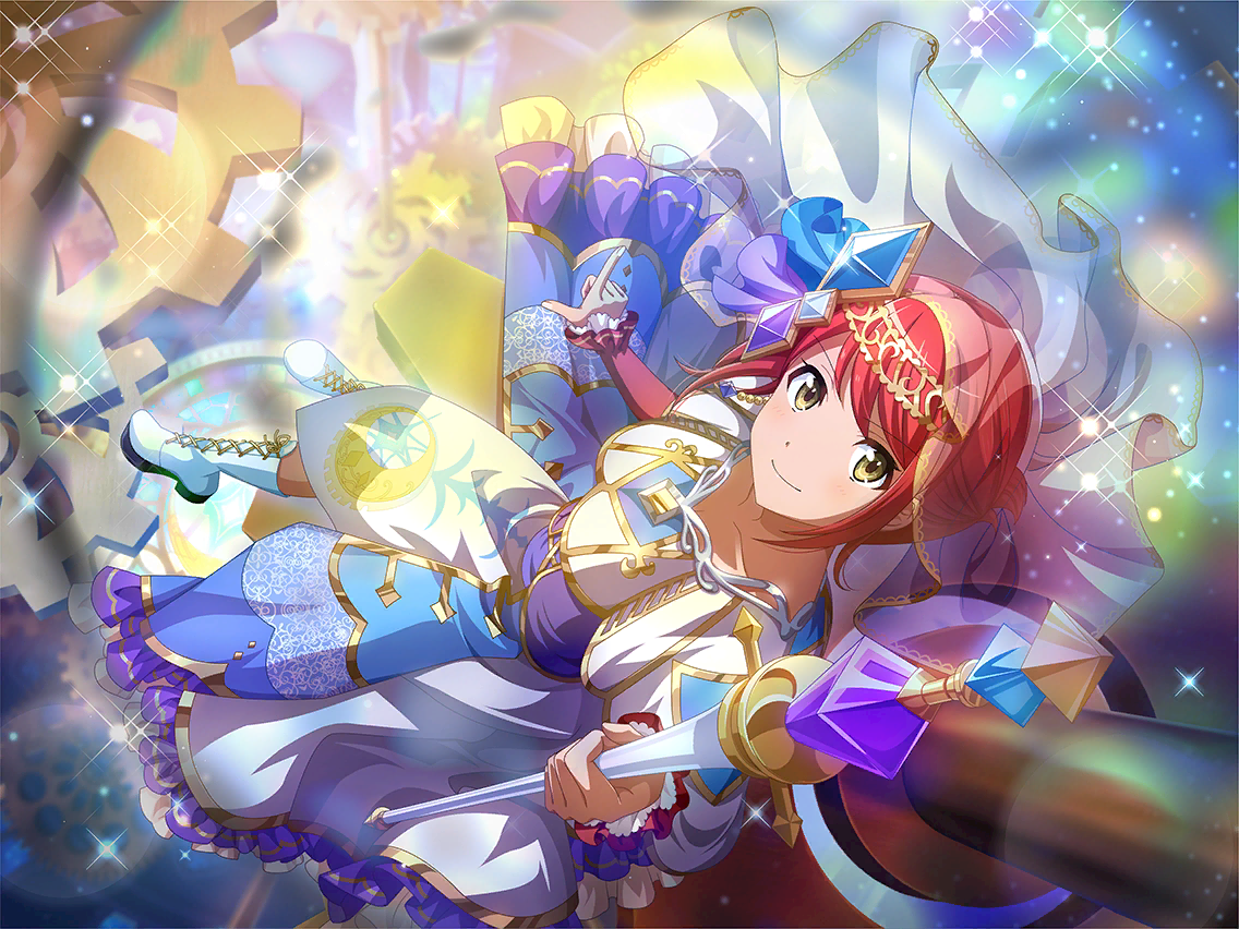 1girl boots closed_mouth collarbone dress finger_gun game_cg gears holding holding_staff kano_misora lace-up_boots looking_at_viewer official_art red_hair red_sleeves see-through_clothes see-through_veil shoujo_kageki_revue_starlight shoujo_kageki_revue_starlight_-re_live- smile solo staff tarot v-shaped_eyebrows veil white_boots white_dress yellow_eyes