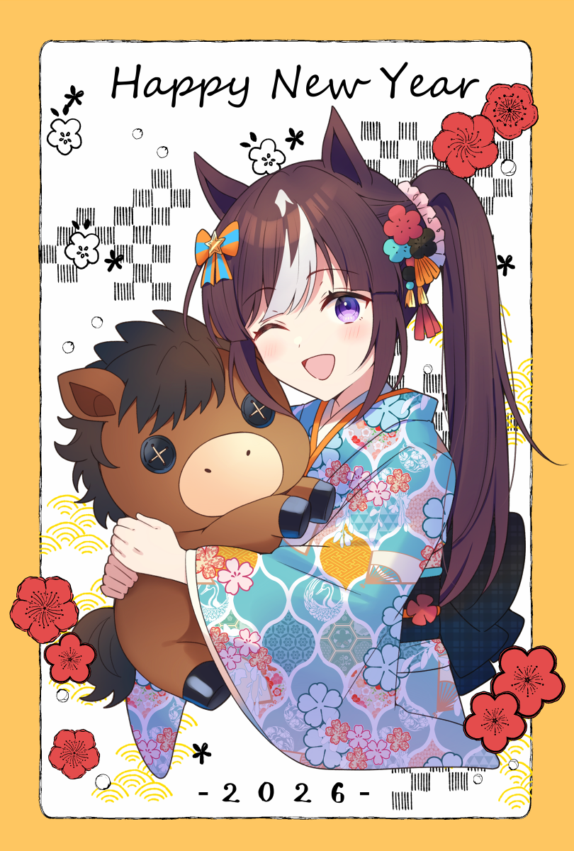 1girl 2026 animal_ears blush bow brown_hair commentary_request creature_and_personification cropped_torso ear_bow floral_print floral_print_kimono flower hair_ornament happy_new_year highres hokko_tarumae_(racehorse) hokko_tarumae_(umamusume) holding holding_stuffed_toy horse_ears horse_girl japanese_clothes kimono long_hair long_sleeves looking_at_viewer multicolored_hair new_year one_eye_closed open_mouth personification ponytail print_kimono purple_eyes smile solo striped_bow striped_hair stuffed_animal stuffed_horse stuffed_toy umamusume white_hair yukichi_(eikichi)