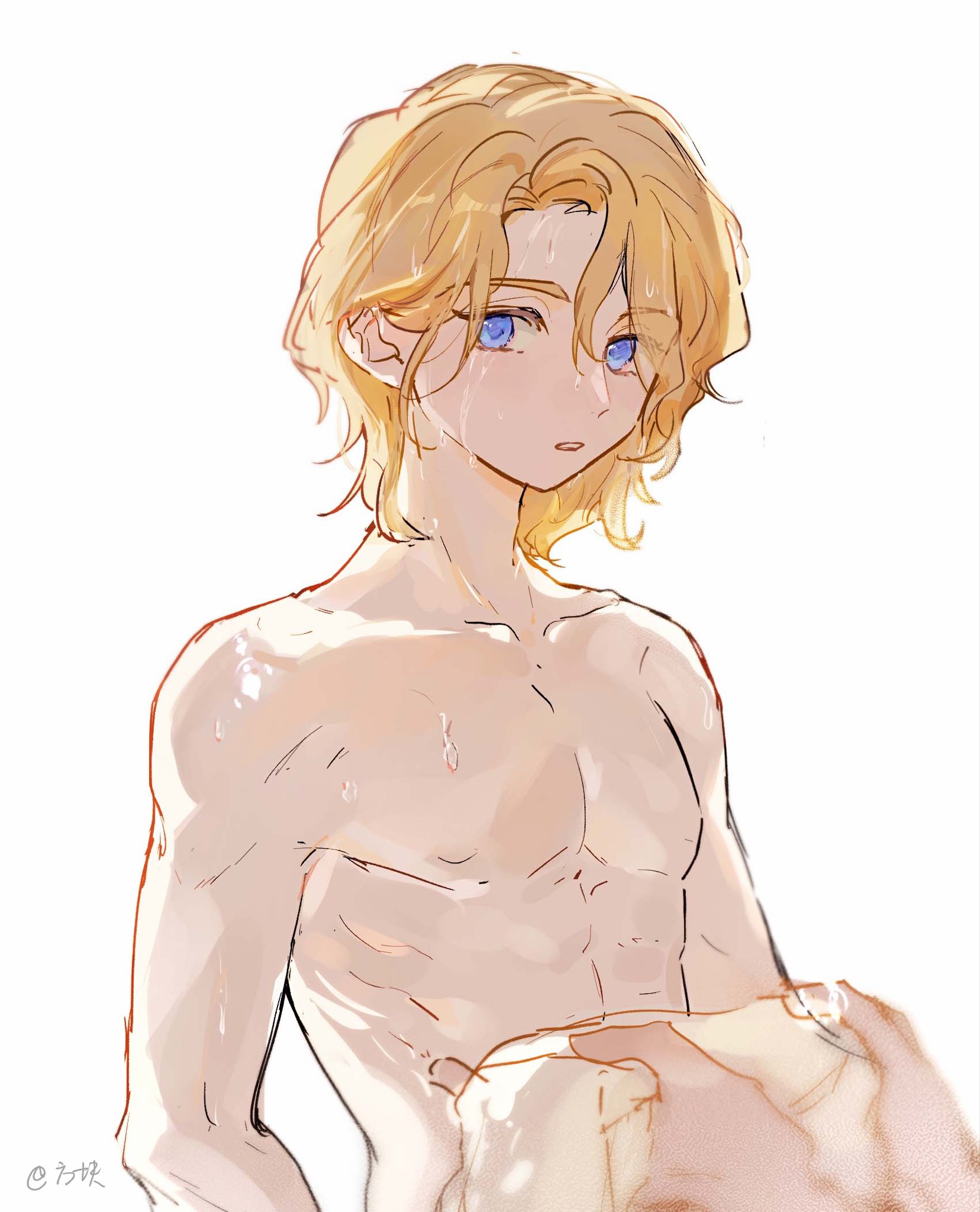 1boy 1other aged_down axis_powers_hetalia blonde_hair blue_eyes cubed_(houkuaid) france_(hetalia) highres looking_at_viewer male_focus nipples open_mouth short_hair simple_background solo_focus upper_body wavy_hair wet wet_hair white_background