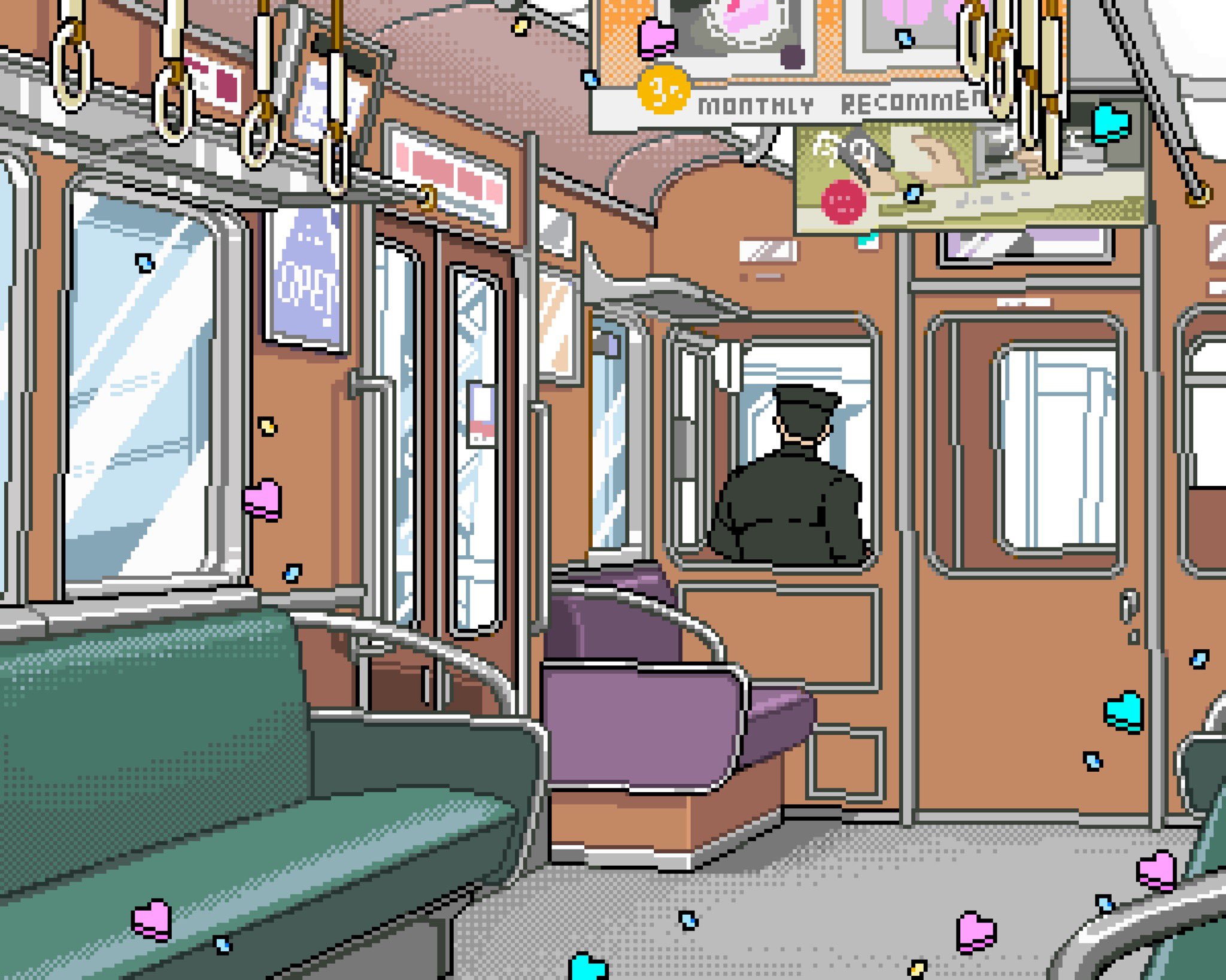 1boy black_hair black_hat commentary dithering english_commentary facing_away hand_grip hat highres original pixel_art scenery short_hair sign solo train_conductor train_interior window yuyu_e
