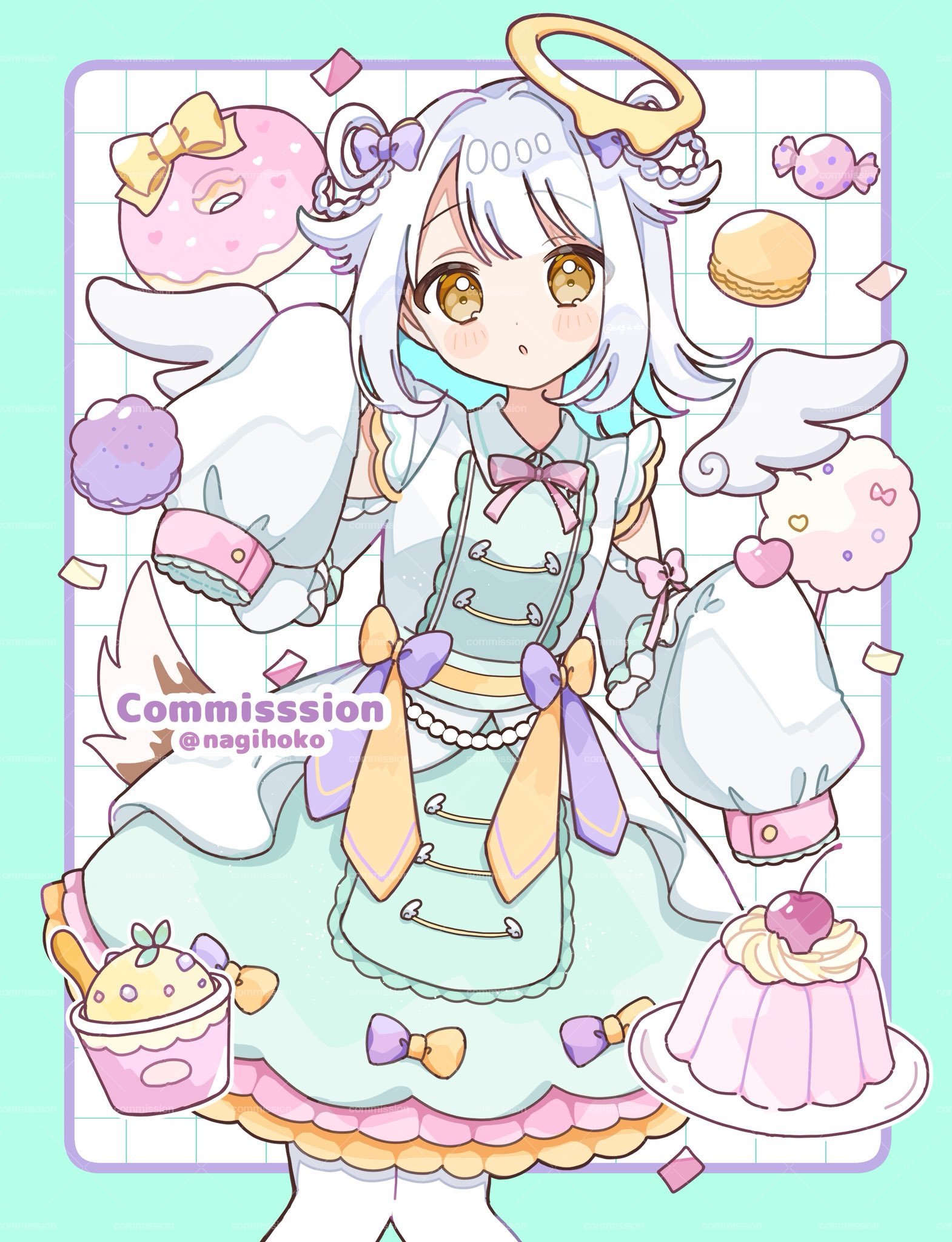 1girl :o blush_stickers border bow bowtie braid braided_hair_rings candy cherry clothing_cutout collared_shirt colored_inner_hair commentary commission donut dosukoi_(nagihoko) dot_nose feet_out_of_frame food fruit fujimiya_chiwa green_border green_skirt grid_background hair_bow hair_rings halo hashtag-only_commentary heart highres ice_cream iriam long_sleeves looking_at_viewer macaron melting_halo multicolored_hair open_mouth outside_border pink_bow pink_bowtie plate pudding purple_bow shirt short_hair shoulder_cutout skeb_commission skirt skirt_bow sleeves_past_fingers sleeves_past_wrists solo standing twitter_username two-tone_bow two_side_up virtual_youtuber white_background white_hair white_shirt wrapped_candy yellow_bow yellow_eyes yellow_halo