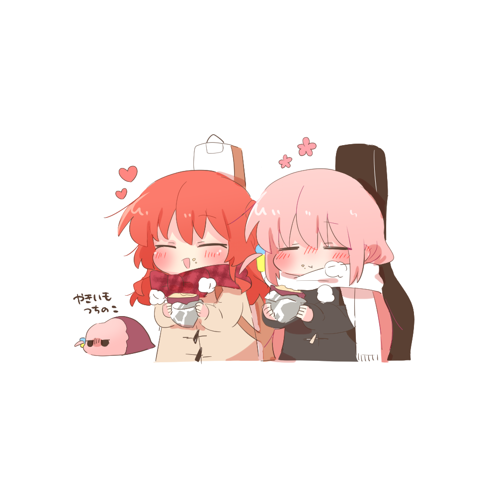 2girls :d black_coat blush bocchi_the_rock! brown_coat chibi chibi_only closed_eyes closed_mouth coat commentary_request cube_hair_ornament eating food gotoh_hitori gotoh_hitori_(tsuchinoko) guitar_case hair_ornament heart holding holding_food instrument_case kita_ikuyo long_hair long_sleeves multiple_girls one_side_up open_mouth pink_hair rebecca_(keinelove) red_hair red_scarf roasted_sweet_potato scarf simple_background smile sweet_potato translation_request white_background white_scarf