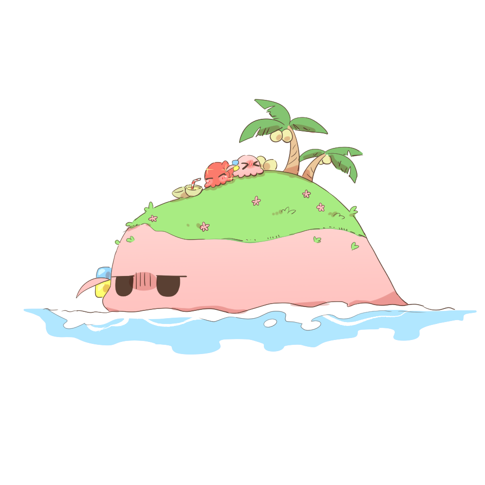 >_< ^_^ bocchi_the_rock! closed_eyes coconut_cup commentary_request cube_hair_ornament drinking_straw flower gotoh_hitori gotoh_hitori_(octopus) gotoh_hitori_(tsuchinoko) grass hair_ornament island kita_ikuyo no_humans ocean palm_tree rebecca_(keinelove) simple_background sparkle tree water white_background
