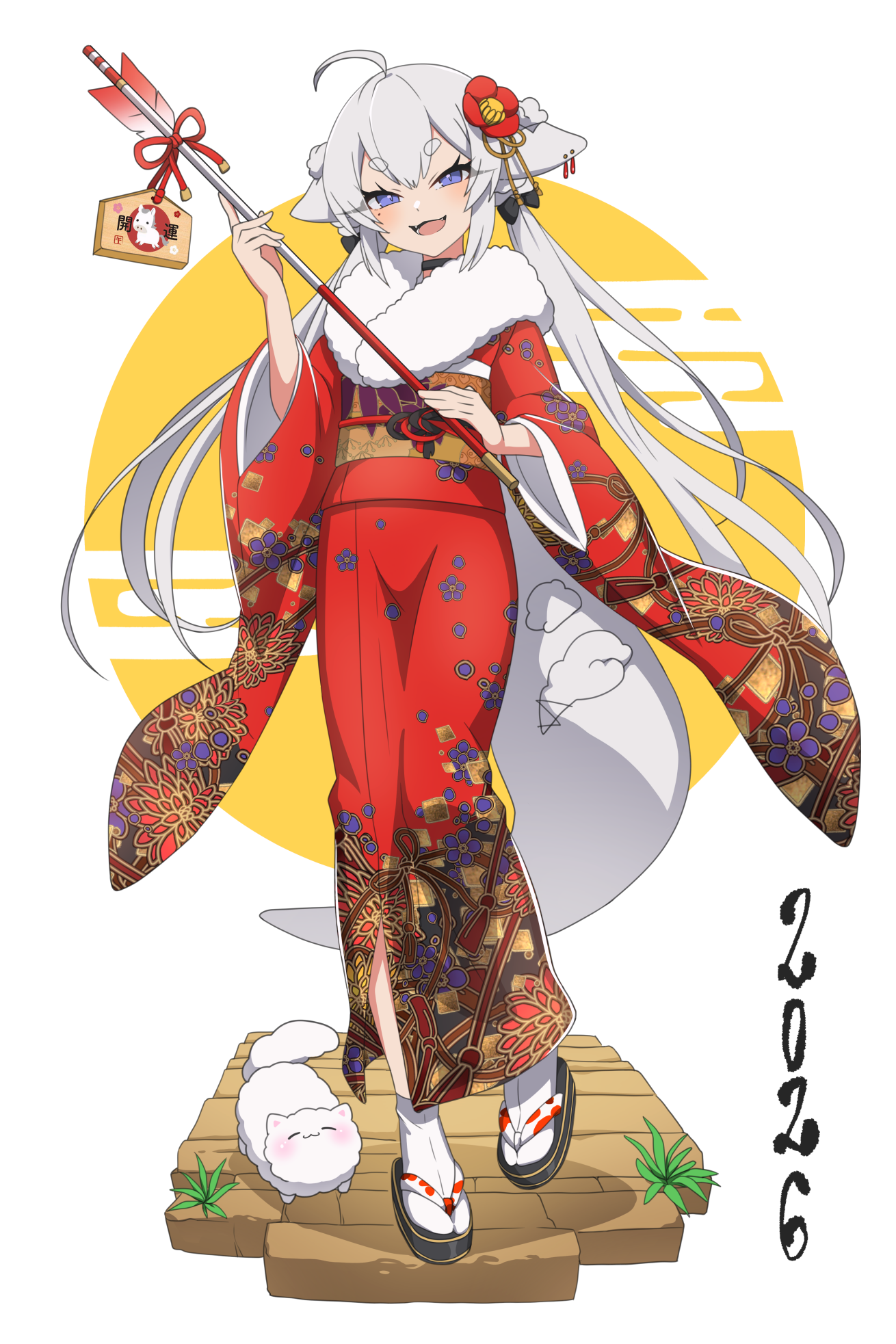 ahoge arrow_(projectile) black_choker camellia cat cat_girl cat_tail choker ema flower fur_scarf geta highres holding holding_arrow indie_virtual_youtuber japanese_clothes kimono long_eyelashes mofu_(vtuber) mofu_mollis nekoromancer new_year obi original purple_eyes sash self-upload sharp_teeth slit_pupils stuffed_toy tabi tail teeth twintails white_hair