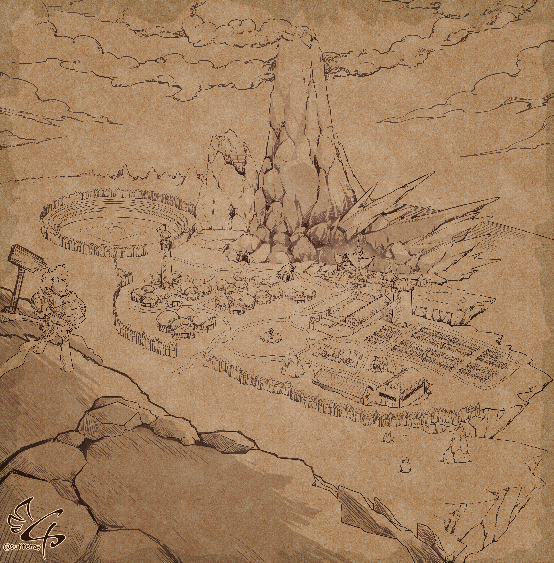 1girl alternate_design armarouge armor artist_name cliff cloud cloudy_sky facing_away farm fence field highres house mountain mountainous_horizon nintendo outline pauldrons perimeter_wall pleated_skirt plume pokemon pokemon_(creature) pokemon_focus scenery sepia shoulder_armor sign signature skirt sky sufferay tower wind wooden_fence