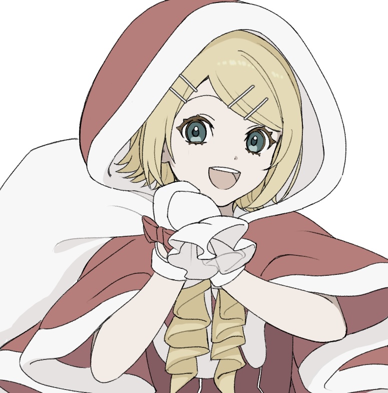 1girl blonde_hair blue_eyes capelet christmas commentary_request fur-trimmed_capelet fur-trimmed_hood fur_trim hair_ornament hairclip holding holding_sack hood kagamine_rin looking_at_viewer mittens open_mouth rainy_3743 sack santa_costume santa_hood short_hair smile solo upper_body vocaloid