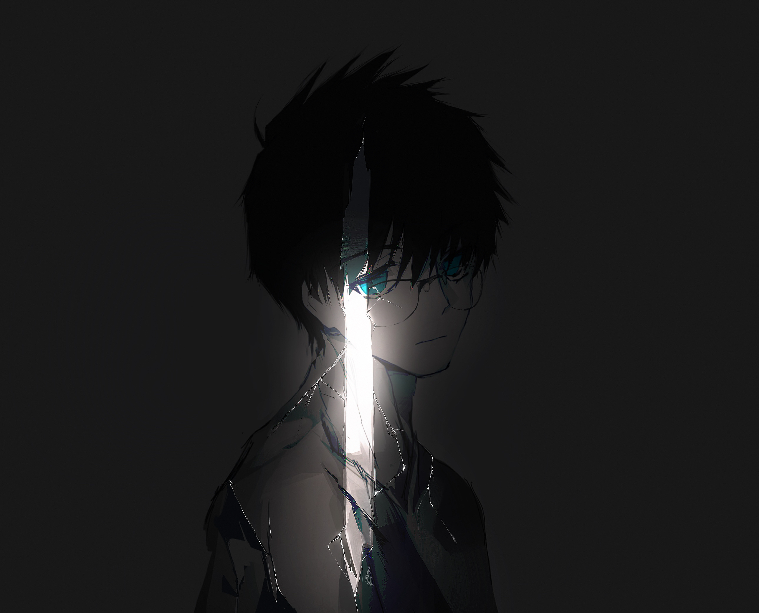 1boy black_hair blue_eyes commentary cracked_skin expressionless glasses hair_between_eyes highres looking_at_another looking_at_viewer male_focus mystic_eyes_of_death_perception profile short_hair tohno_shiki tsukihime user_ymxd2858
