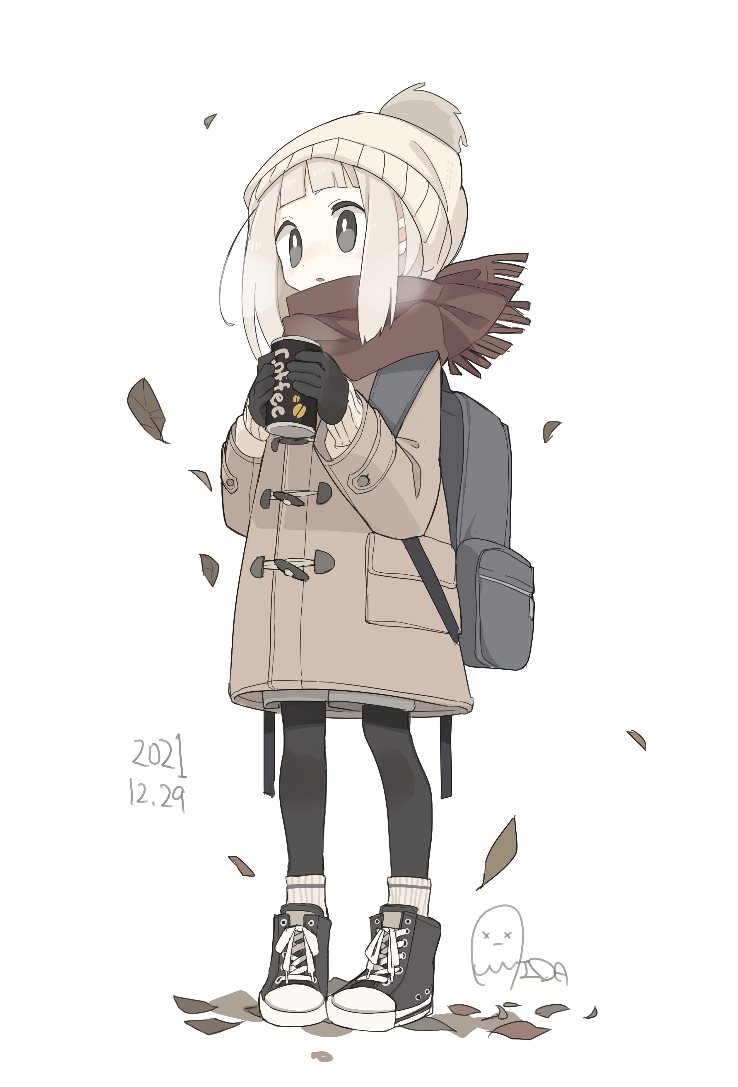 1girl absurdres aida_(aidia) autumn autumn_leaves backpack bag beanie black_bag black_eyes black_gloves black_pantyhose black_shoes blonde_hair blunt_bangs breath bright_pupils brown_coat brown_scarf can canned_coffee coat commentary_request dated drink drink_can falling_leaves full_body gloves hat highres holding holding_can holding_drink leaf long_hair long_sleeves looking_ahead original pantyhose parted_lips pigeon-toed pom_pom_(clothes) pom_pom_beanie ribbed_socks scarf shoes shorts signature simple_background socks socks_over_pantyhose solo standing sweater white_background white_hat white_pupils white_shorts white_socks white_sweater winter_clothes winter_coat