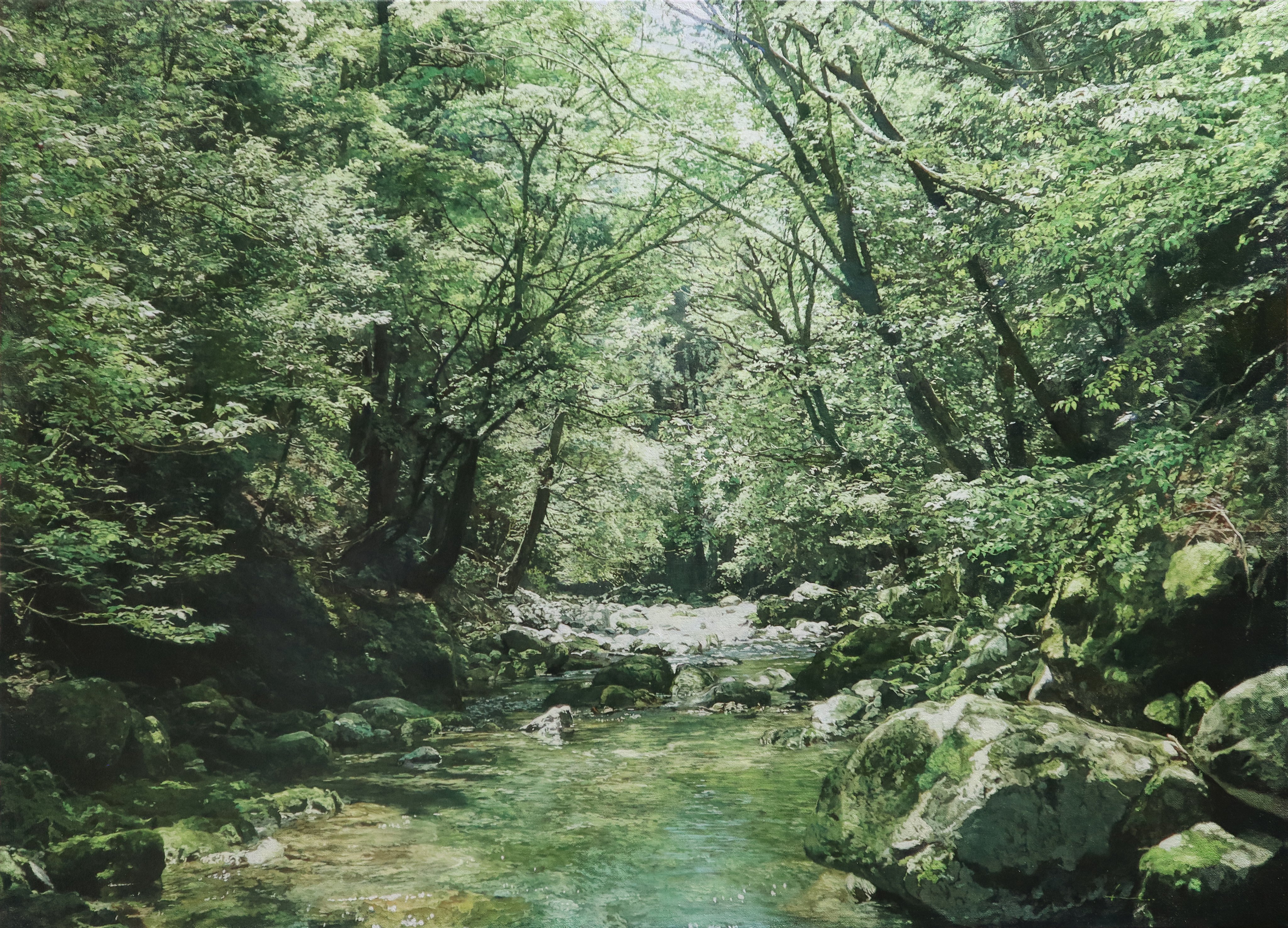 absurdres commentary_request day forest highres naohiro_ito nature oil_painting_(medium) original outdoors painting_(medium) photorealistic realistic rock scenery shadow stream sunlight traditional_media tree tree_shade water
