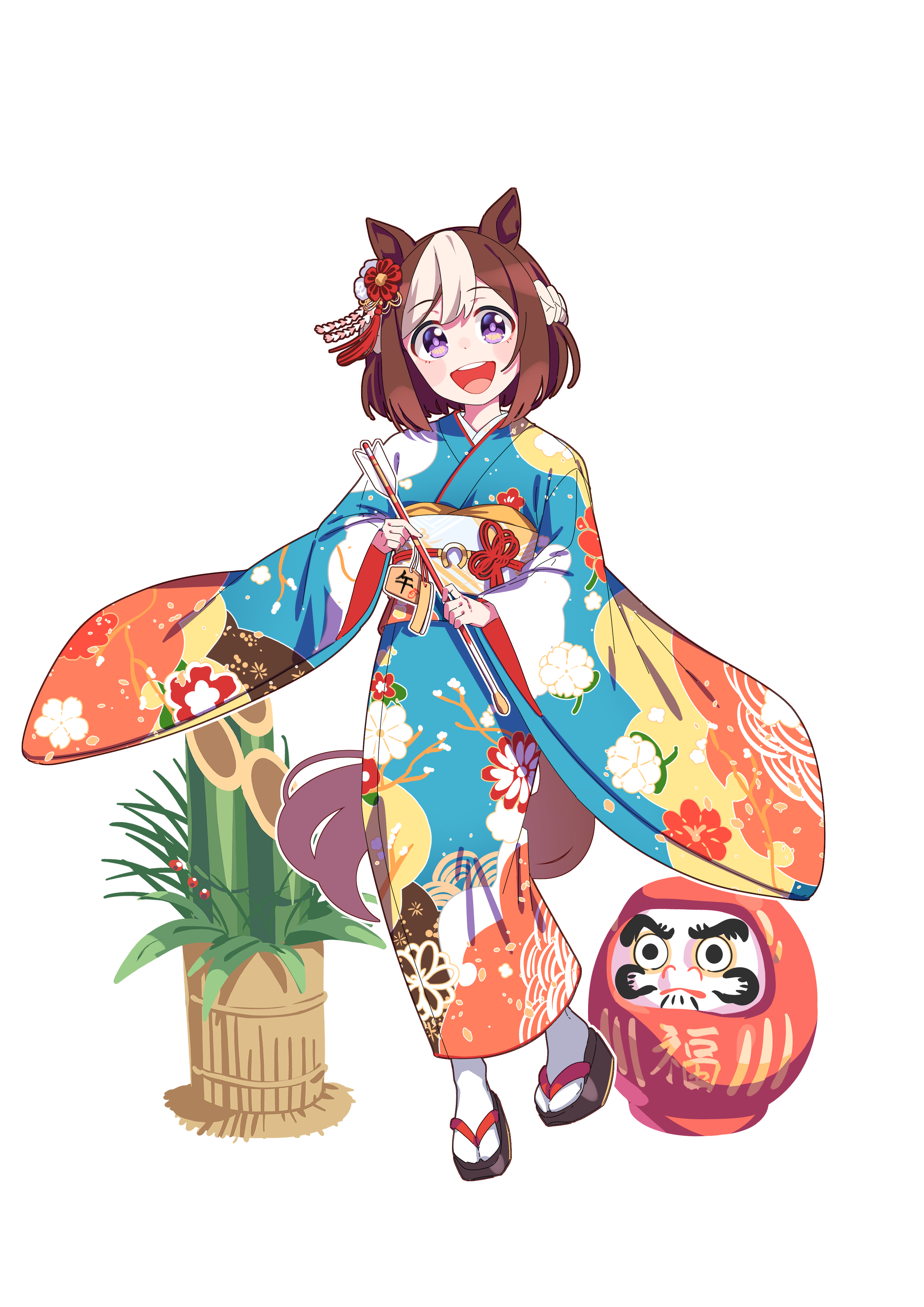 1girl absurdres alternate_costume animal_ears arrow_(projectile) bamboo blue_kimono blush braid brown_hair commentary_request daruma_doll ear_flower floral_print floral_print_kimono flower hair_flower hair_ornament hamaya happy_new_year highres holding holding_arrow horse_ears horse_girl horse_tail japanese_clothes kimono long_hair long_sleeves multicolored_hair new_year obi open_mouth print_kimono purple_eyes sandals sash short_hair simple_background smile socks special_week_(umamusume) tail teeth textless_version tpicm two-tone_hair umamusume upper_teeth_only white_background white_hair white_socks