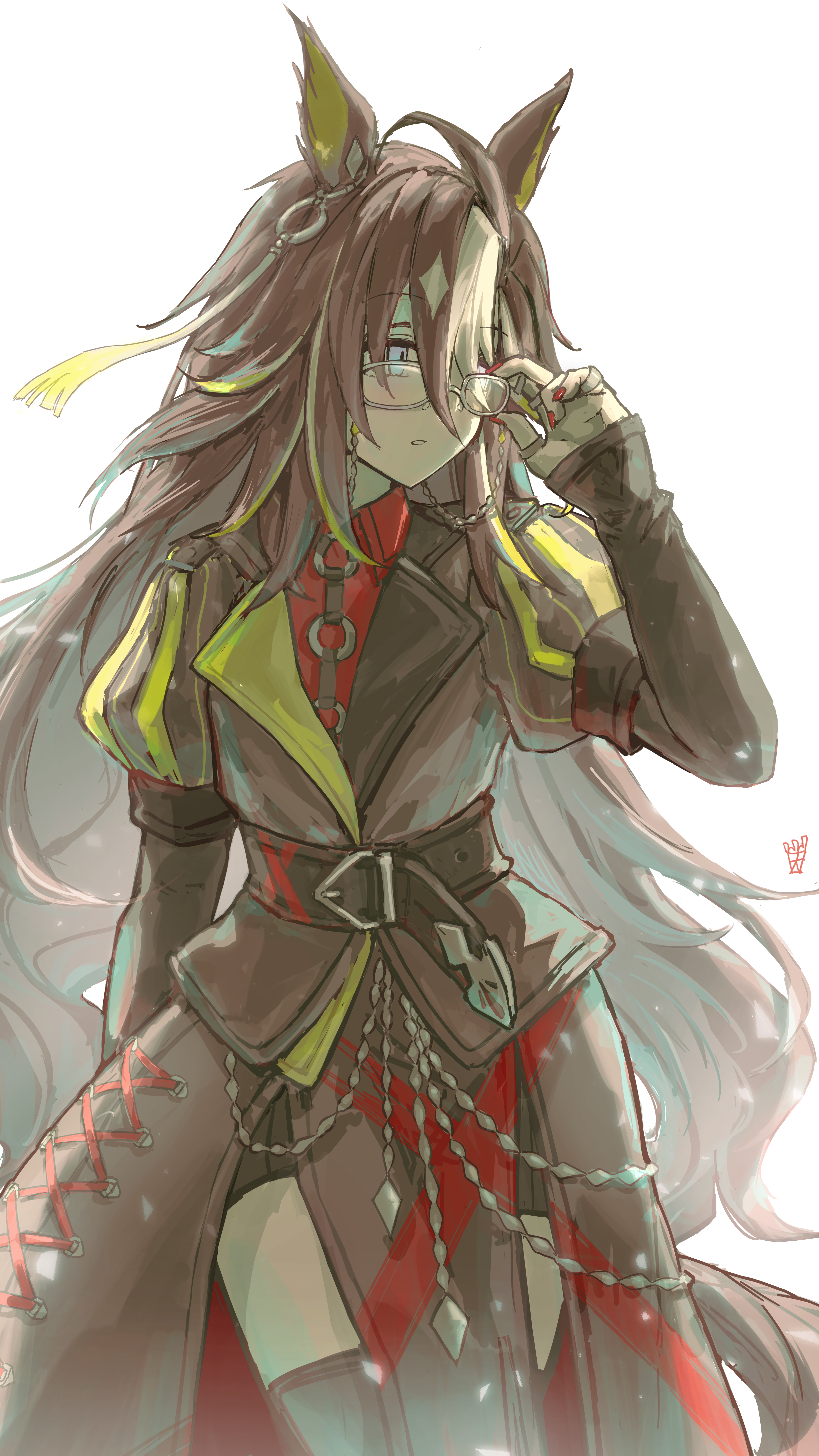 1girl absurdres adjusting_eyewear animal_ears belt black_belt black_coat black_thighhighs blonde_streaks brown_hair coat colored_inner_animal_ears commentary dream_journey_(reminder_of_dreamland)_(umamusume) dream_journey_(umamusume) eyewear_strap glasses highres horse_ears horse_girl horse_tail jewelry long_hair multicolored_hair multiple_rings ootato pelvic_curtain ring simple_background single_hair_intake solo streaked_hair tail thighhighs umamusume white_background white_streaks