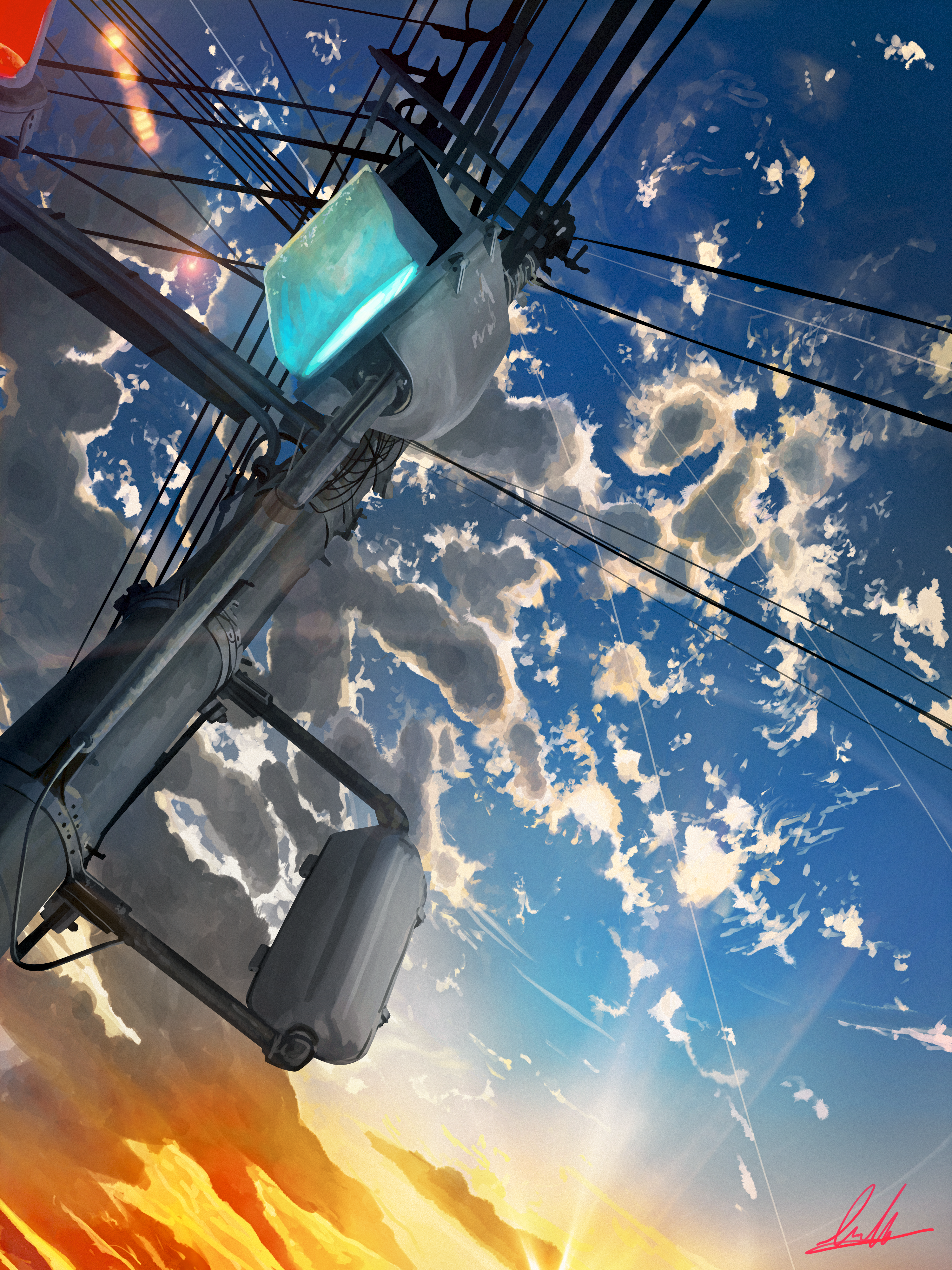 absurdres banishment blue_sky cloud commentary_request contrail evening gradient_sky highres lens_flare no_humans orange_sky original outdoors power_lines scenery sky sunset utility_pole