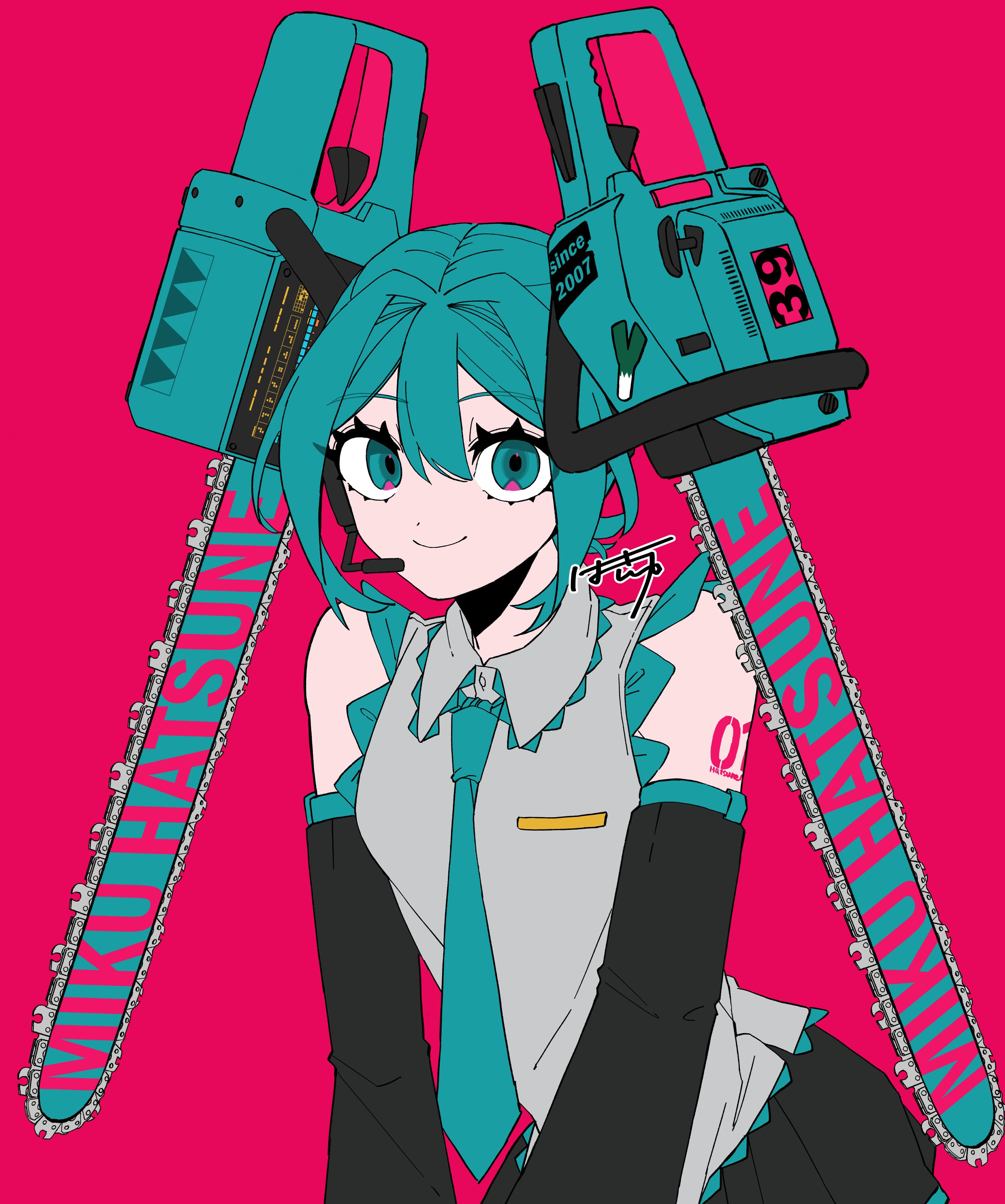 1girl absurdres aqua_eyes aqua_hair aqua_nails aqua_necktie aqua_trim arm_tattoo bare_shoulders black_sleeves chainsaw commentary_request detached_sleeves eiku grey_shirt hair_between_eyes hair_ornament hatsune_miku headphones headset highres looking_at_viewer miniskirt necktie number_tattoo pleated_skirt shirt skirt sleeveless sleeveless_shirt smile solo spring_onion tattoo twintails upper_body vocaloid