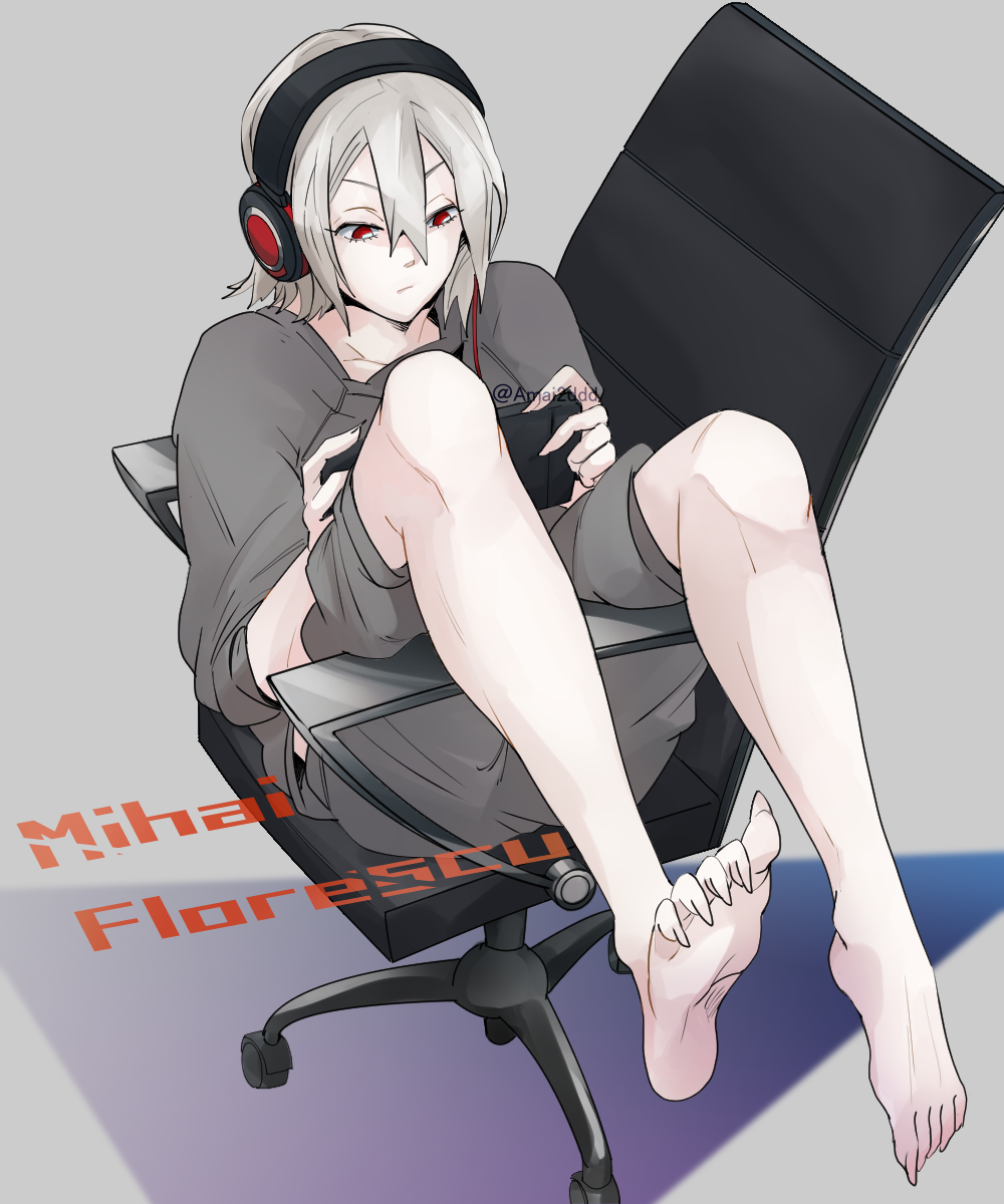1boy chair character_name closed_mouth dabu_(dabuchan) feet full_body grey_background grey_hair headphones highres kemono_jihen male_focus medium_hair mihai_florescu red_eyes solo
