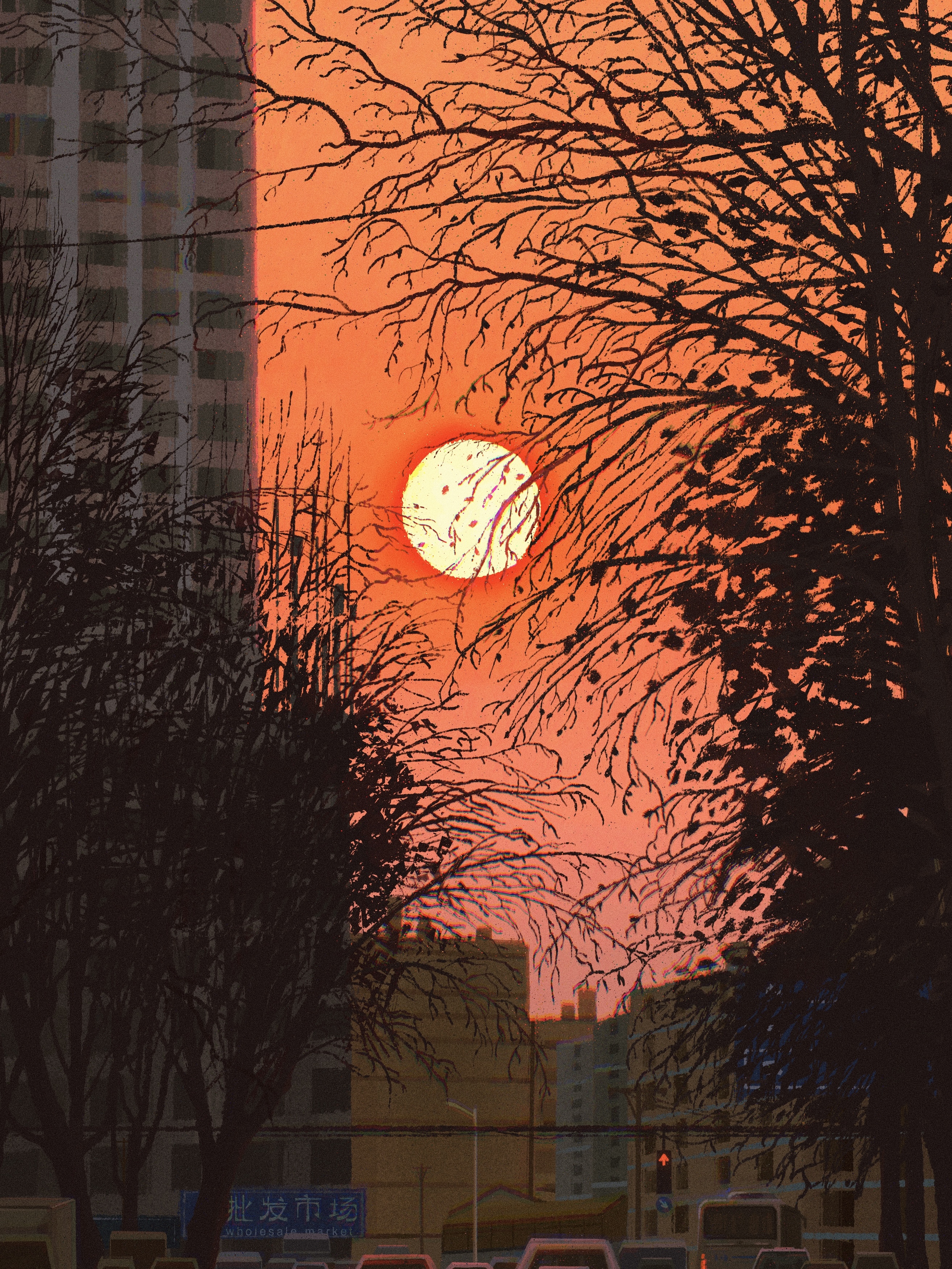 absurdres bare_tree car chinese_commentary cityscape commentary_request evening fangpeii highres mixed-language_text motor_vehicle no_humans orange_sky original outdoors power_lines scenery sign sky sun sunset traffic traffic_light translation_request tree