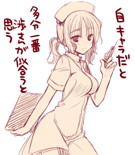 1girl arm_behind_back breasts closed_mouth collared_dress commentary_request cowboy_shot dress dual_wielding hair_between_eyes hand_up hat holding holding_syringe large_breasts light_blush looking_at_viewer low_twintails medium_hair muririn nurse nurse_cap official_artist_extra parted_bangs short_sleeves simple_background sketch smile solo split_mouth syringe tenshinranman thick_eyebrows translation_request twintails white_background yamabuki_wataru