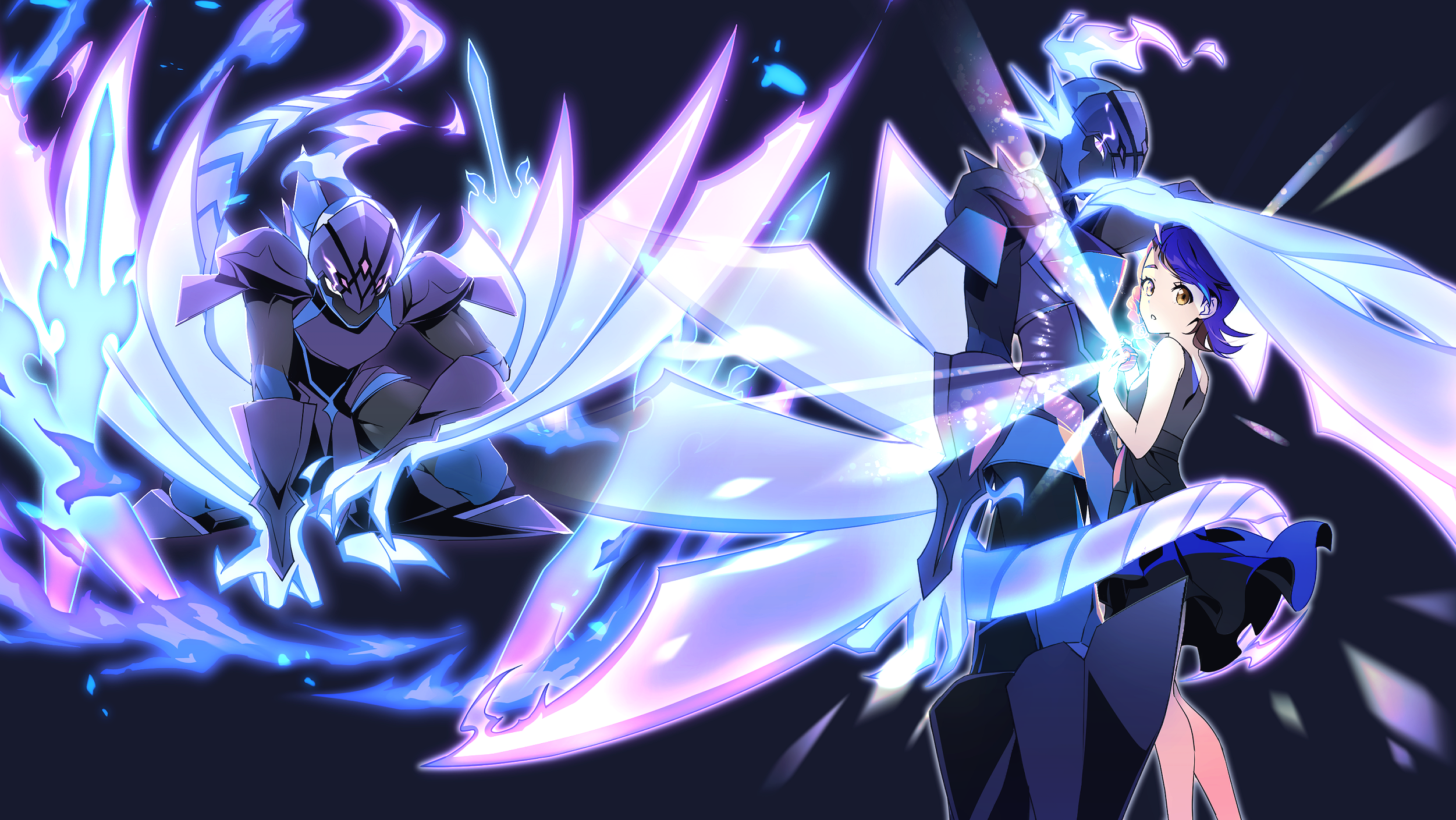 1boy 1girl alternate_form arm_blade armor arms_at_sides bare_shoulders black_dress blue_background braid breastplate brown_hair ceruledge claws colored_skin commentary_request dragon_claw dragon_tail dragon_wings dress facing_another fighting_stance fire glowing glowing_eyes glowing_sword glowing_weapon hand_on_ground highres hitodama holding holding_poke_ball holding_tera_orb juliana_(pokemon) leaning_on_person leg_armor light_rays looking_to_the_side multiple_views nintendo pauldrons planted planted_sword planted_weapon plume poke_ball pokemon pokemon_(creature) pokemon_sv purple_armor purple_skin shoulder_armor side_braid sword tail tera_orb terastallization tom_(leciel2010) turning_head weapon wings