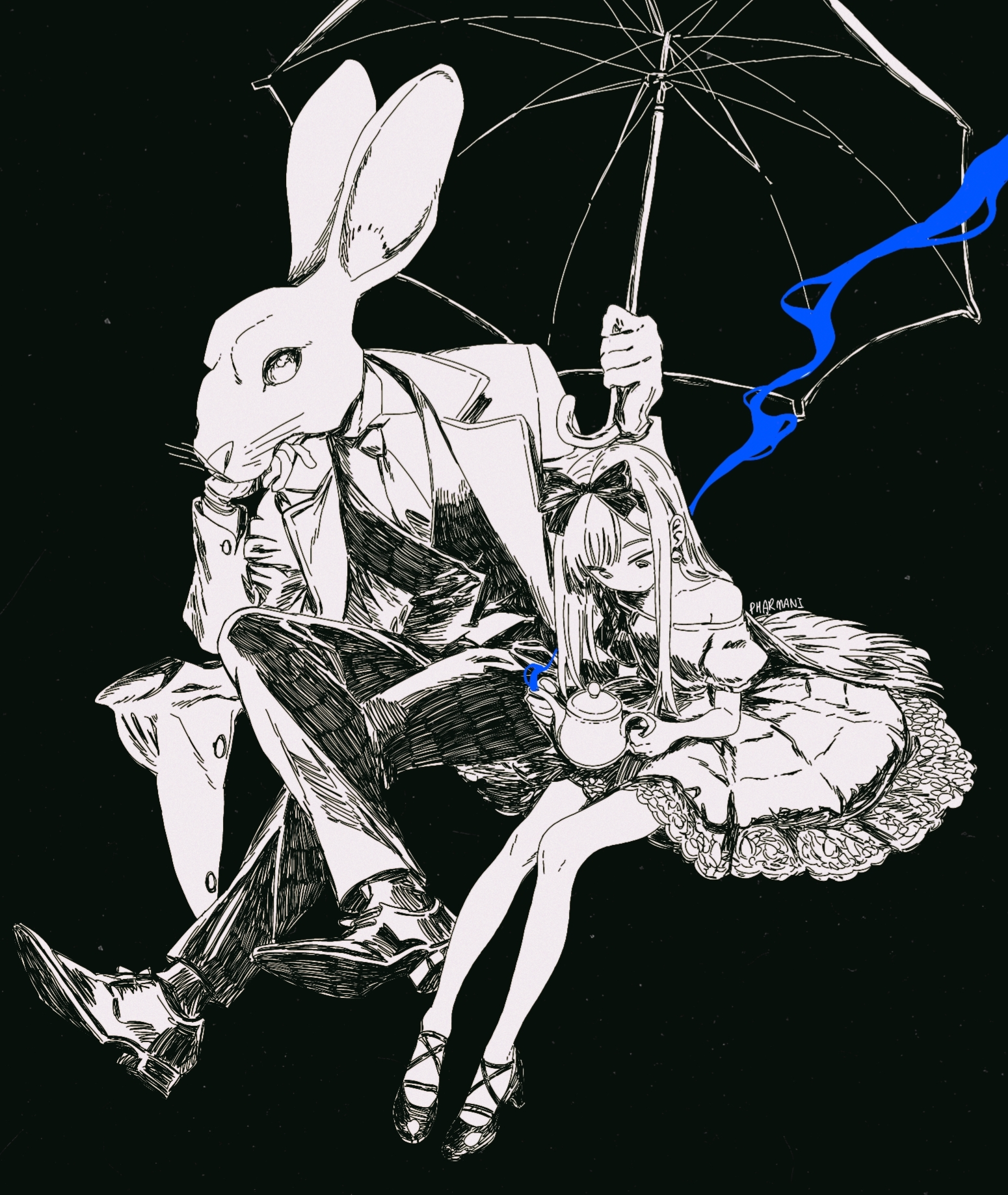 1boy 1girl alice's_adventures_in_wonderland alice_(alice_in_wonderland) bare_shoulders black_background blunt_bangs bow child circle_skirt closed_mouth coat collarbone collared_shirt crossed_legs daekkon dot_mouth dress dress_pants dress_shoes frilled_skirt frills from_above furry gloves greyscale hair_bow hand_on_own_chin high_heels highres hime_cut holding holding_teapot holding_umbrella long_hair long_sidelocks looking_down monochrome necktie off-shoulder_dress off_shoulder overcoat puffy_short_sleeves puffy_sleeves rabbit shirt short_sleeves sidelocks signature sitting sketch skirt smoke smoke_trail socks spot_color teapot umbrella vest waistcoat whiskers white_rabbit_(alice_in_wonderland)