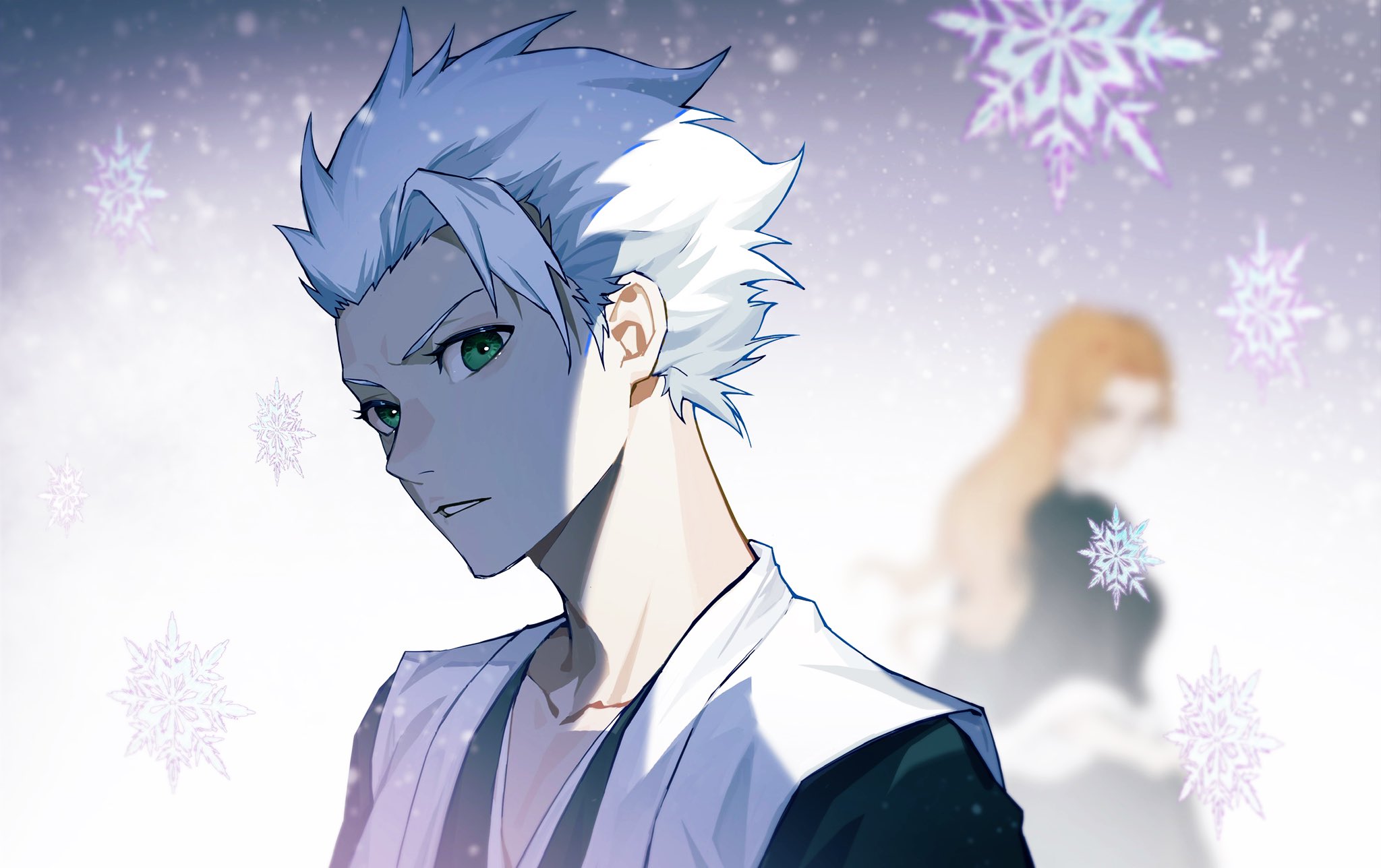 1boy 1girl bleach blurry blurry_background commentary commission english_commentary green_eyes guozhi_(artist) highres hitsugaya_toushirou long_hair matsumoto_rangiku orange_hair portrait profile second-party_source snowflakes snowing solo_focus white_hair