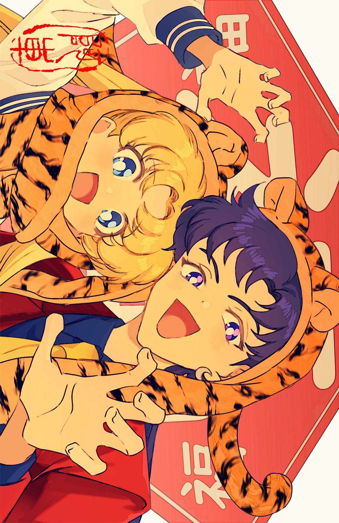 2girls ache_jiao_ache animal_ears animal_hood bishoujo_senshi_sailor_moon black_hair blonde_hair blue_eyes blue_sailor_collar claw_pose detached_hood fake_animal_ears highres hood jacket long_hair multiple_girls ponytail purple_eyes red_jacket reverse_trap sailor_collar school_uniform seiya_kou serafuku sideways signature tiger_ears tiger_hood tsukino_usagi twintails
