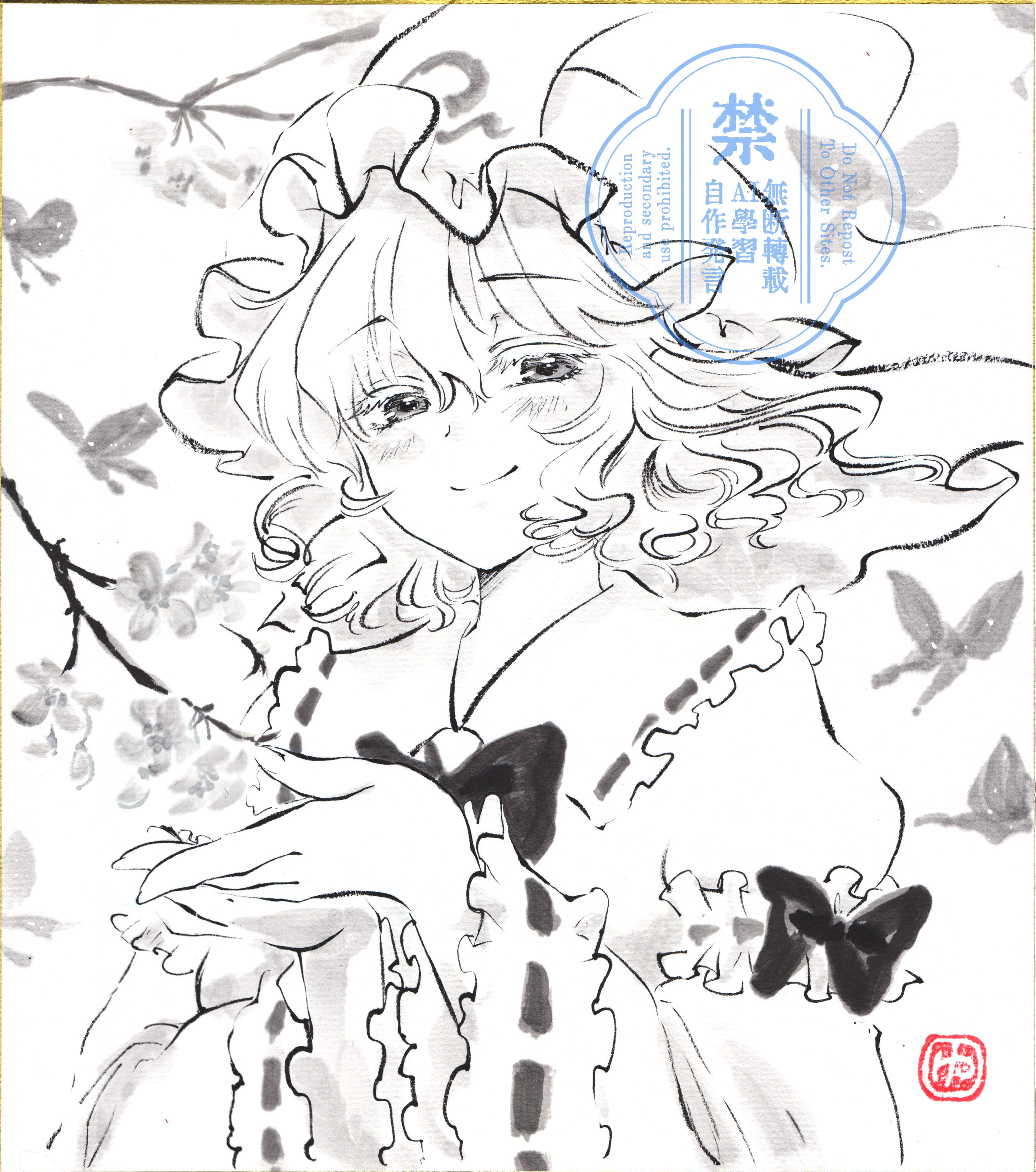 1girl absurdres bug butterfly cherry_blossoms closed_mouth commentary english_commentary frilled_kimono frills greyscale hat highres insect japanese_clothes kimono long_sleeves looking_at_viewer medium_hair mob_cap monochrome saigyouji_yuyuko shikishi sleeve_garter smile solo sumi-e touhou traditional_media triangular_headpiece watermark wide_sleeves yuzuha_(yuzutime)