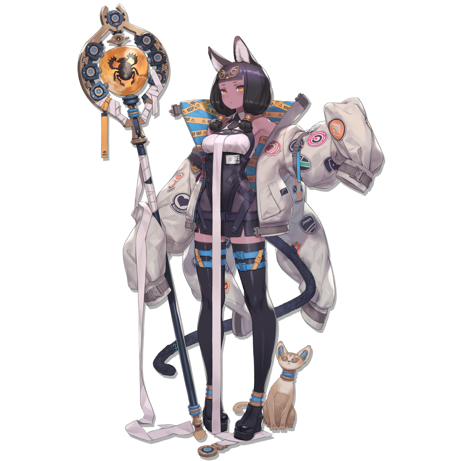 1girl ancient_egyptian animal_ear_fluff animal_ears anklet arknights bandages beetle belt black_belt black_dress black_hair black_necktie black_shoes black_thighhighs blue_belt blunt_bangs bug cat cat_ears cat_girl cat_tail caution_tape closed_mouth collared_shirt dark-skinned_female dark_skin dress english_text framed_breasts full_body grey_belt heart high_collar highleg highleg_dress highres holding holding_staff id_card insect jacket jewelry keep_out kuroboshi_kouhaku long_sleeves looking_at_viewer medium_hair miniskirt mio_(beast_lord)_(arknights) multiple_belts necktie official_art open_clothes open_jacket oversized_jacket pocket shirt shoes short_necktie simple_background skirt sleeve_belt sleeveless sleeveless_shirt solo staff standing tachi-e tail thigh_belt thigh_strap thighhighs third-party_source titi_(arknights) transparent_background white_jacket white_shirt yellow_belt yellow_eyes zettai_ryouiki