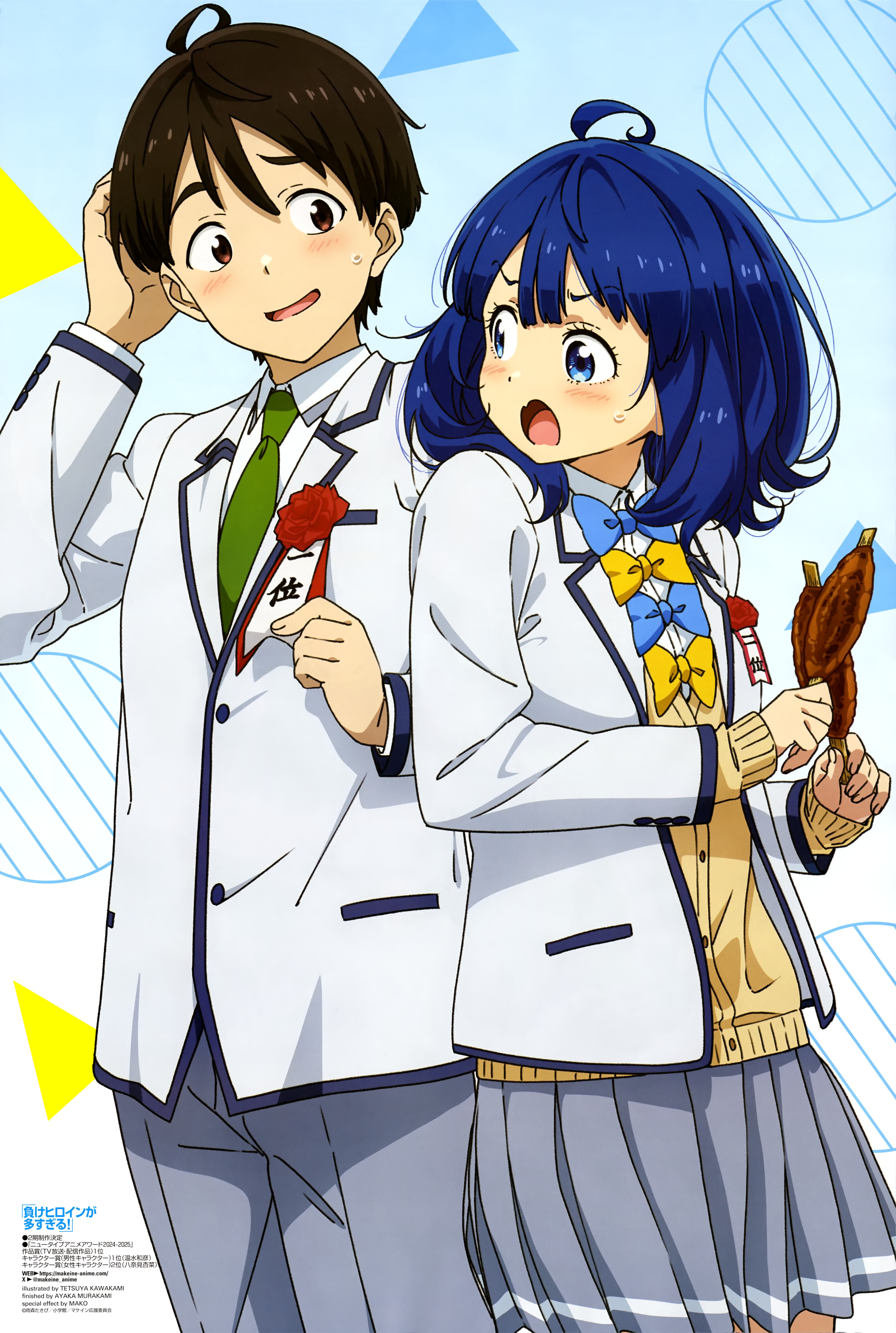 1boy 1girl absurdres ahoge anime_coloring blazer blue_bow blue_bowtie blue_eyes blue_hair blush bow bowtie brown_eyes brown_hair cardigan cocked_eyebrow collared_shirt cowboy_shot double-parted_bangs food green_necktie grey_pants grey_skirt hair_between_eyes hand_on_own_head highres holding holding_food jacket kawakami_tetsuya looking_at_another magazine_scan make_heroine_ga_oo_sugiru! medium_hair necktie newtype nukumizu_kazuhiko official_art open_clothes open_jacket open_mouth pants pleated_skirt scan school_uniform shirt short_hair side-by-side skirt sweatdrop third-party_source tsuwabuki_high_school_uniform white_jacket white_shirt yanami_anna yellow_bow yellow_bowtie yellow_cardigan