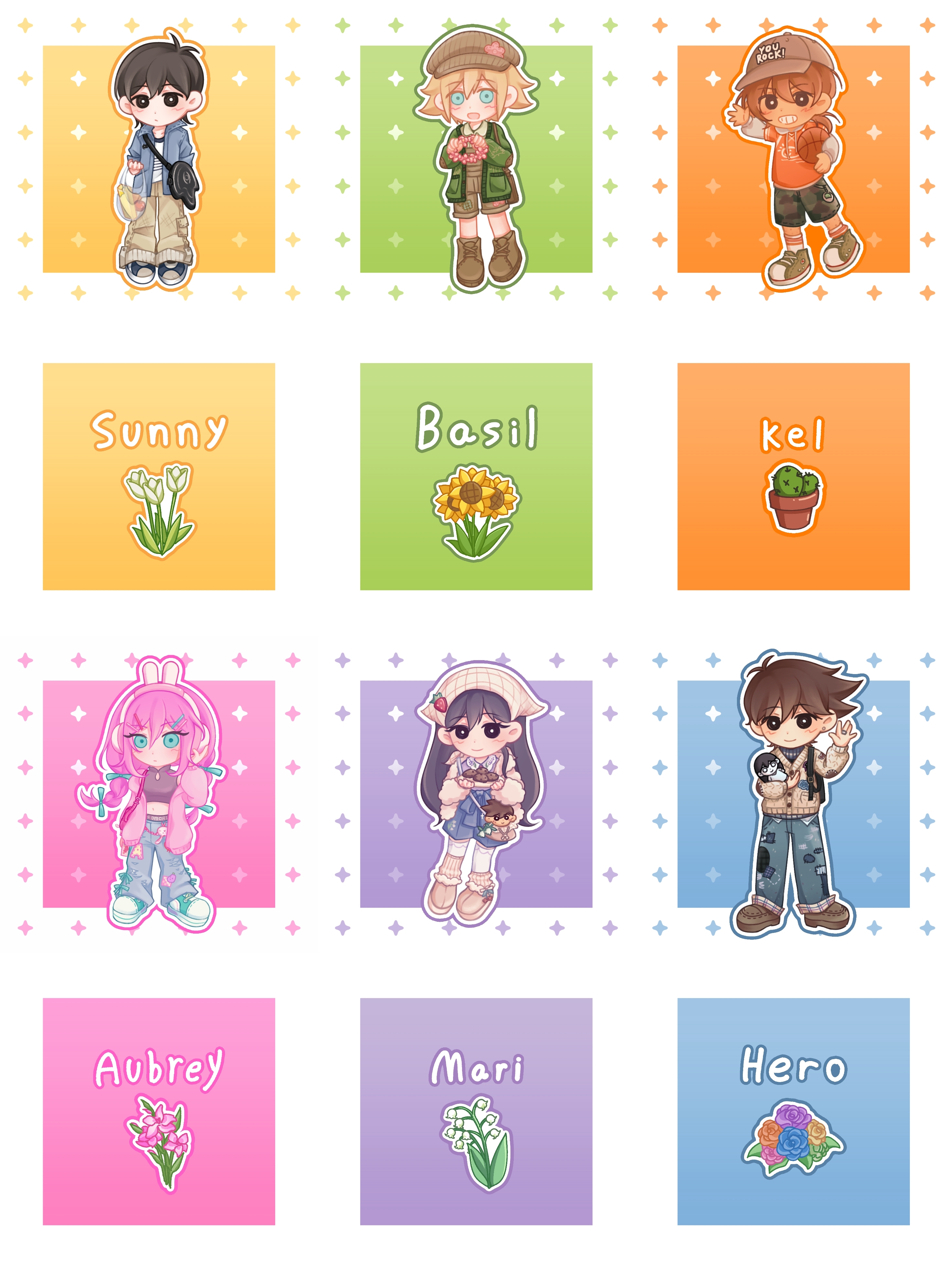 2girls 4boys :d :| \||/ absurdres adjusting_headphones animal_charm animal_ear_headphones animal_ears antenna_hair aqua_shoes aubrey_(birthday)_(omori) aubrey_(faraway)_(omori) aubrey_(omori) bag bag_charm baggy_pants ball bare_shoulders baseball_cap basil_(birthday)_(omori) basil_(faraway)_(omori) basil_(omori) basketball_(object) belt black_bag black_belt black_eyes black_hair black_shirt black_shorts blonde_hair blue_bow blue_eyes blue_flower blue_jacket blue_outline blue_pants blue_ribbon blue_rose blue_shoes blue_shorts blush boots border bow braid bright_pupils brother_and_sister brothers brown_bag brown_boots brown_hair brown_hat brown_overalls brown_pants brown_shoes cactus camouflage camouflage_shorts cardigan cardigan_partially_removed character_bag character_charm character_doll character_name charm_(object) chibi chibi_only chinese_commentary chocolate_chip_cookie closed_mouth clothes_writing clothing_cutout collared_jacket collared_shirt commentary_request converse cookie copyright_name crop_top cropped_shirt dark-skinned_male dark_skin deformed denim doll dot_nose double-parted_bangs double_horizontal_stripe drawstring ear_piercing elbow_carry english_text expressionless fake_animal_ears flower flower_pot flower_wreath food forest_bunny?_(omori) full_body gladiolus green_cardigan green_outline green_shoes grey_hat grey_hoodie grid_teeth grin hair_behind_ear hair_between_eyes hair_bow hair_ornament hairclip hand_up handbag hat head_wreath headphones headscarf hector_(omori) hero_(birthday)_(omori) hero_(faraway)_(omori) hero_(omori) highres holding holding_bag holding_ball holding_head_wreath holding_stuffed_toy hood hood_down hoodie jacket jeans kel_(birthday)_(omori) kel_(faraway)_(omori) kel_(omori) kneehighs layered_sleeves leg_hair legs_apart lily_of_the_valley long_hair long_sleeves looking_at_viewer low_ponytail low_twin_braids male_focus mari_(birthday)_(omori) mari_(faraway)_(omori) mari_(omori) mari_(spirit)_(omori) mewo midriff mr._plantegg_(omori) multiple_boys multiple_girls navel newsboy_cap no_sclera official_alternate_costume official_alternate_hairstyle omori open_cardigan open_clothes open_jacket open_mouth orange_background orange_flower orange_outline orange_rose orange_shirt outline outside_border outstretched_arm overall_shorts overalls pants parallel_hairclips piercing pink_background pink_bag pink_cardigan pink_flower pink_hair pink_outline pink_rose plant plastic_bag ponytail potted_plant puffy_long_sleeves puffy_sleeves purple_flower purple_outline purple_rose rabbit_ear_headphones rabbit_ears rainbrey_0801 ribbon ribbon-trimmed_pants rose shirt shoelaces shoes short-sleeved_jacket short_hair short_over_long_sleeves short_ponytail short_sleeves shorts shoulder_bag siblings sidelocks simple_background sleeveless sleeveless_turtleneck smile sneakers socks something_(omori) sparkle standing standing_on_one_leg star_(symbol) stuffed_animal stuffed_toy sunflower sunny_(birthday)_(omori) sunny_(omori) sweater tareme thighhighs torn_clothes torn_jeans torn_pants tulip turtleneck turtleneck_shirt turtleneck_sweater twin_braids very_long_hair waving white_border white_cardigan white_flower white_headscarf white_jacket white_outline white_pupils white_shirt white_socks white_thighhighs white_tulip yellow_flower yellow_outline yellow_rose
